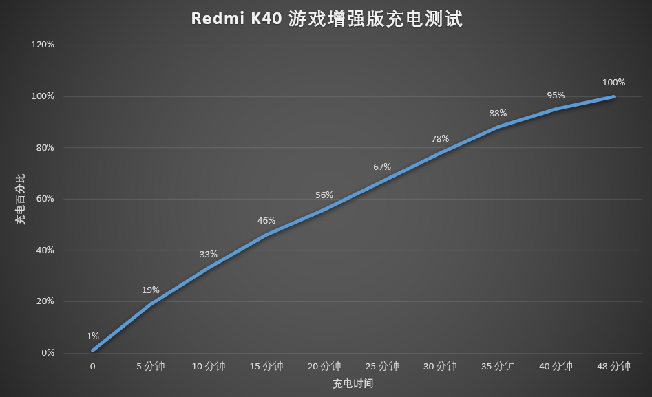 之前我们在RedmiK40Pro的评测文章中也说过,虽然它只匹配了33W快充,不过整体充电速度依旧比较理想。但由于RedmiK40游戏增强版电池容量整整多了了545mAh,再用33W快充方案可能就显得有些捉襟见肘了,所以这次Redmi为其匹配了67W闪充(不支持无线充电)。