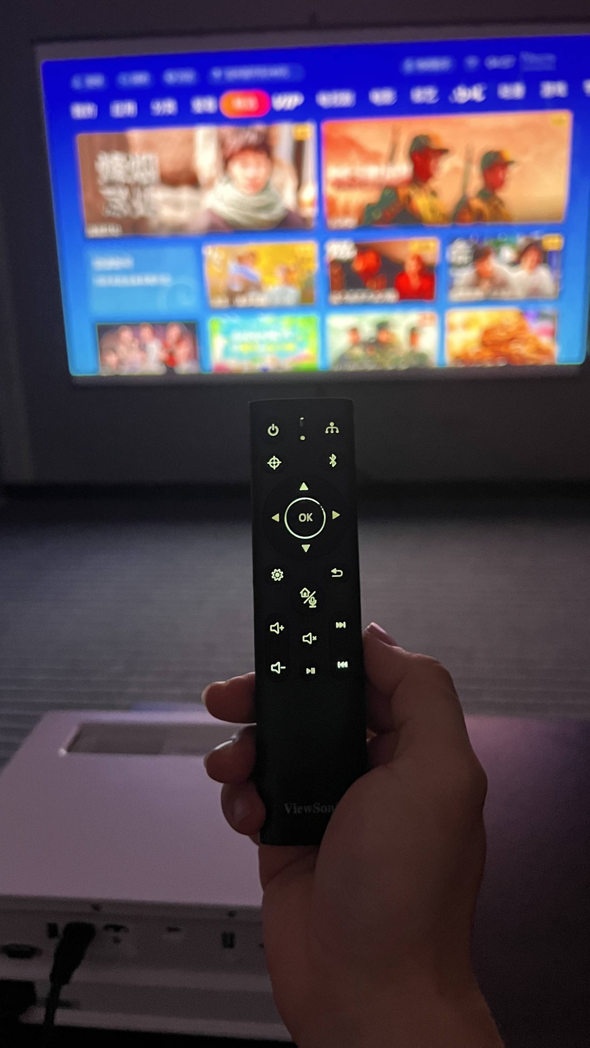 值得一提的是优派的K701虽然外观和701PRO一样,但遥控器升级了,这遥控器是和Q20一样的,遥控器内置重力感应装置,黑暗环境下拿起遥控器,背光会自动亮起,方便您的操控;同时遥控器表面带有银离子的特殊涂层。
