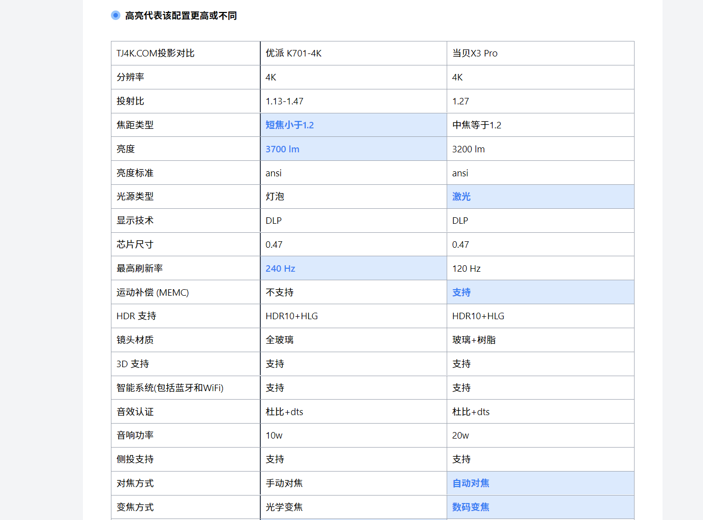 这是我对比工具自动生成的表格。先来说说对投射比,和焦距。优派的K701是1.13的最小投射比,而当贝X3PRO略微大点1.27。虽然我已经科普过很多次,但太多人还是没直观的理解投射比。因为跟电视的尺寸不一样,投影仪没有尺寸,只有投射比,尺寸是需要距离去算的。