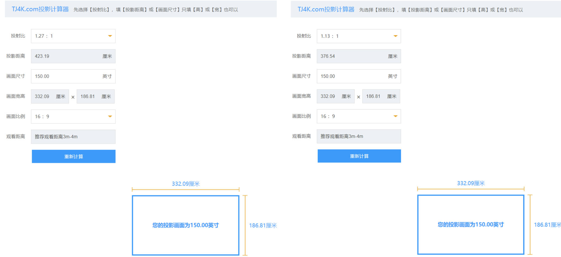 因为太多人不知道怎么算,所以我做数据的时候特意的做了100寸,120寸,150寸的安装距离数据,加上特有的评点。当然算的是镜头到画面,大家安装的时候还要加上机器的宽度和预留接电源线HDMI线的宽度。所以这个距离是大约的,忽略了1.2后面的小数点。只是先直观的看出区别。