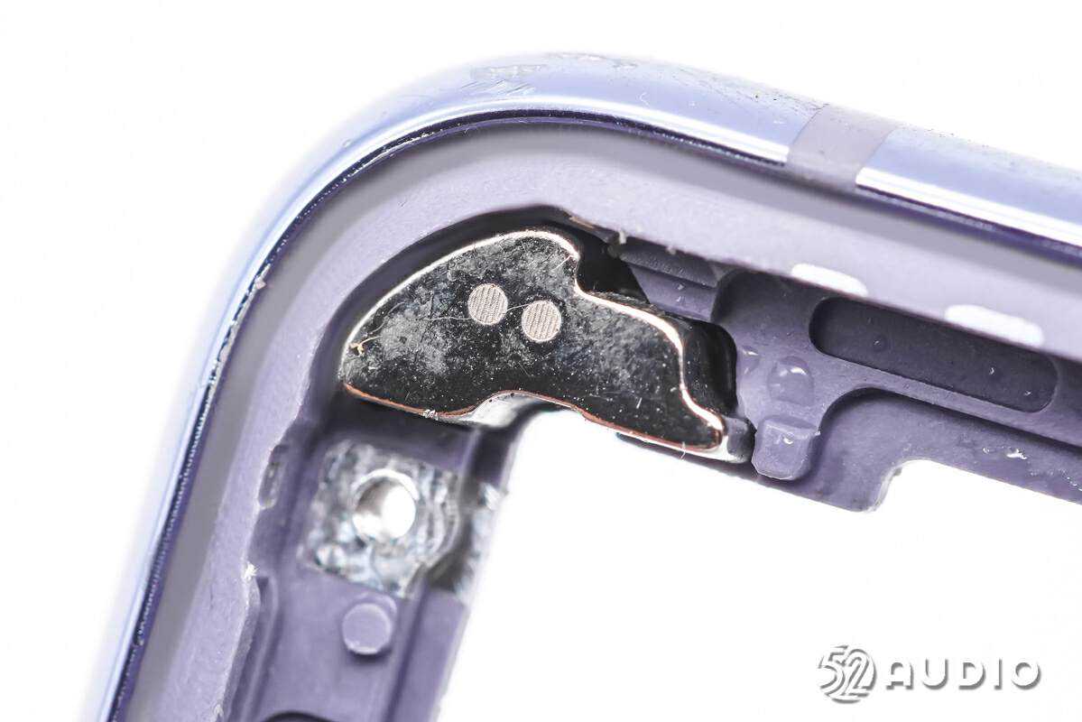 右上角的磁铁特写,采用了契合腔体的异形设计,高精度的尺寸和适当的材料选型满足吸力要求。与右下角的磁铁呈相对向异极,主要作用为磁吸附,保障折叠屏手机开闭屏时的稳定性。