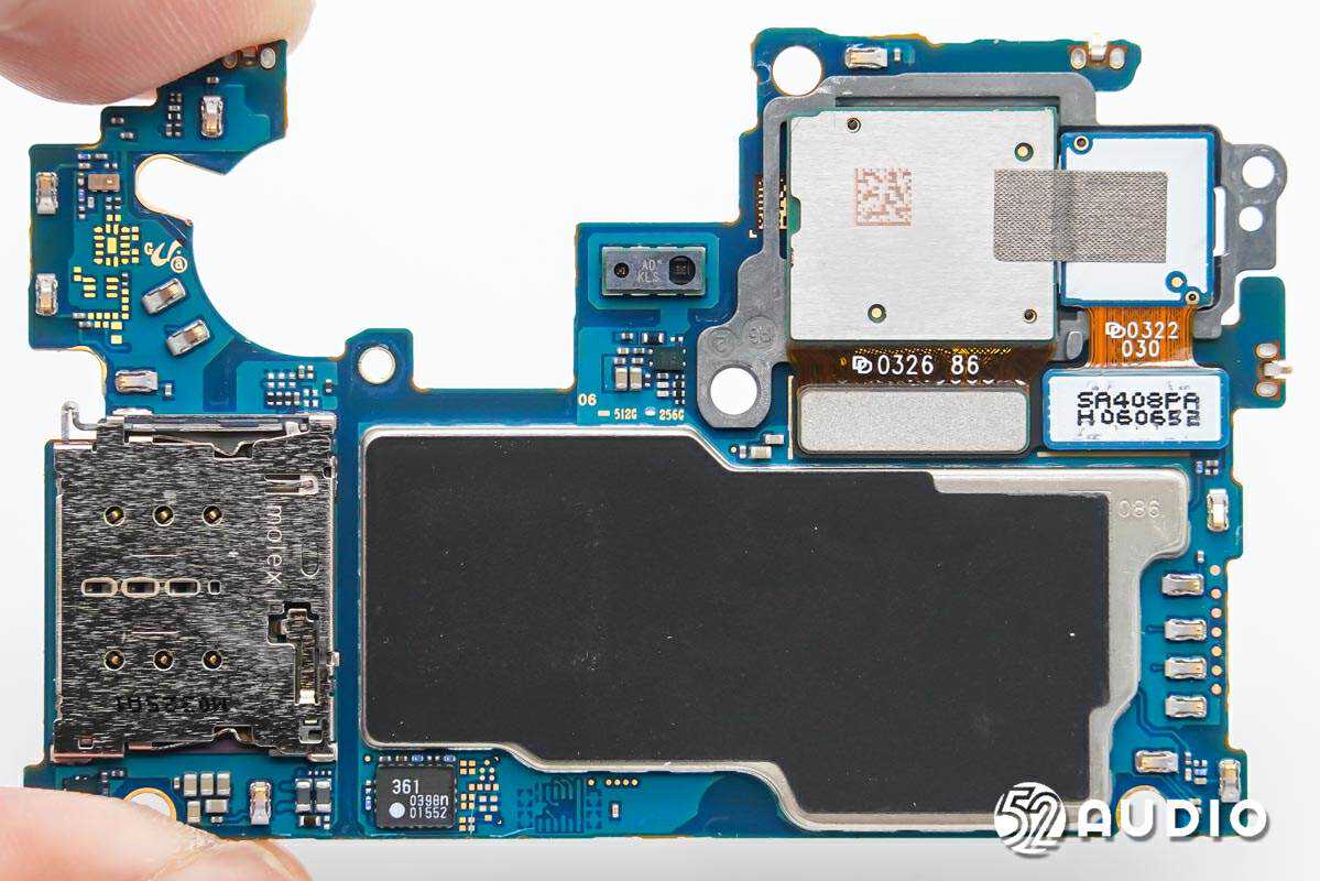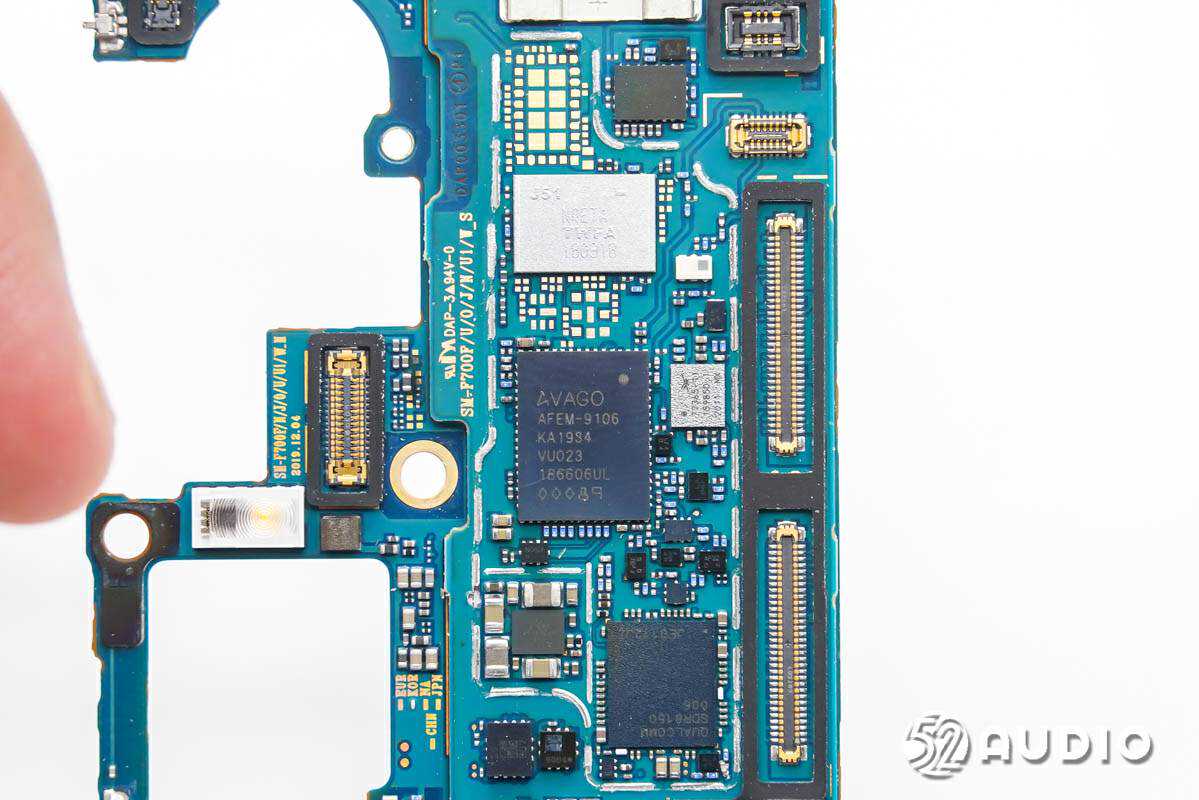 手机主板采用堆叠式设计,能够大幅节省机身内部空间。主要配置上,采用了Qualcomm高通骁龙855Plus处理器,SAMSUNG三星K3UH7H7内存、256GBKLUEG8UHHDB-C2D1闪存;ADI亚德诺MAX77705C电源管理芯片;高通WCN3998WiFi/蓝牙芯片;高通SDR8150射频收发器;AVago安华高AFEM-9106前端模块;Skyworks思佳讯SKY77365-11功率放大器,思佳讯78160-51低噪声放大器;以及ST意法半导体LSM6DSOWTR六轴传感器等。