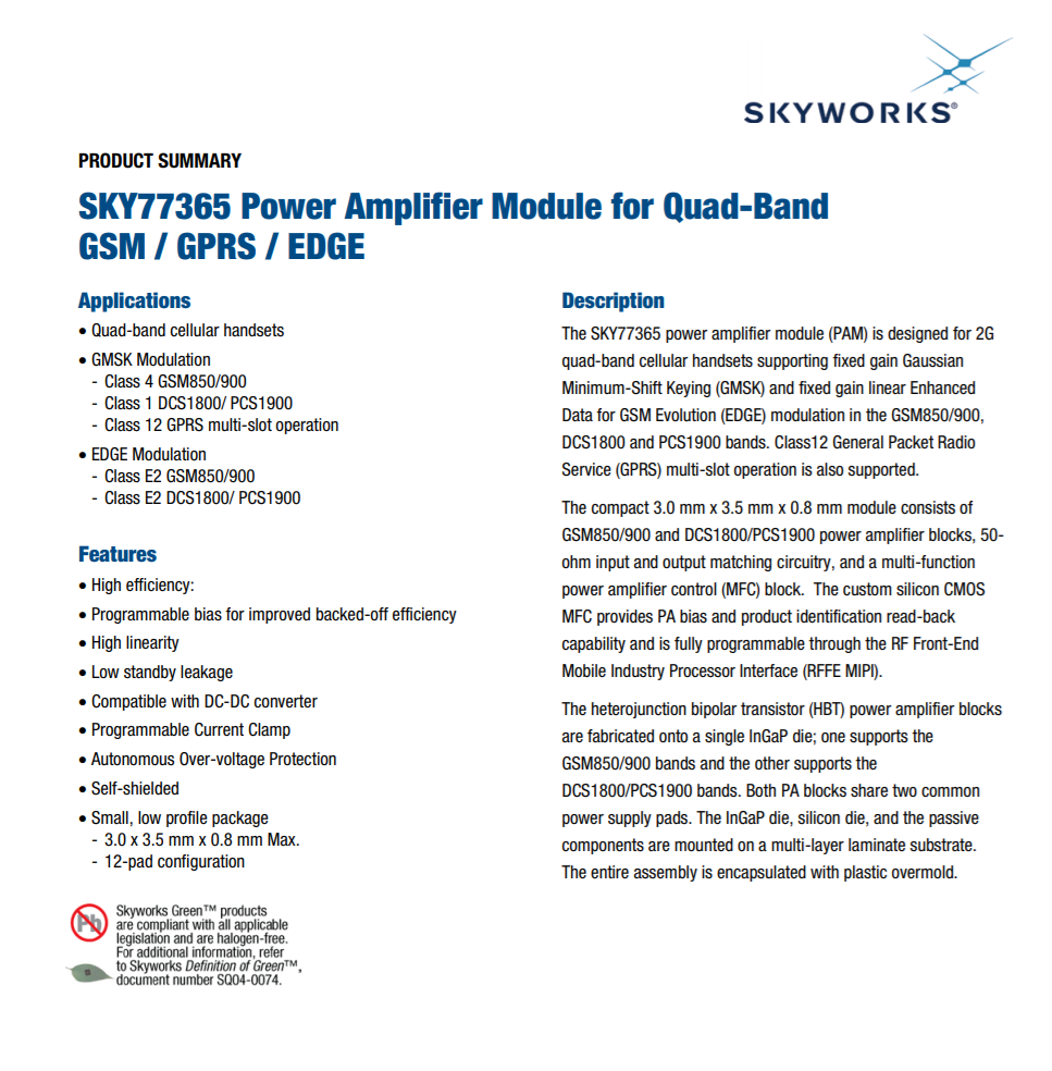 Skyworks思佳讯SKY77365-11GSM/GPRS/EDGE四频段功率放大器模块(PAM)。