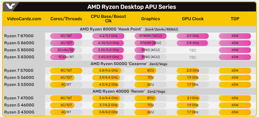 规格方面,所有锐龙8000G系列APU的默认TDP均为65W,并配备了RDNA3集成显卡,分别是Radeon780M(12CU)、Radeon760M(8CU)和Radeon740M(4CU)。