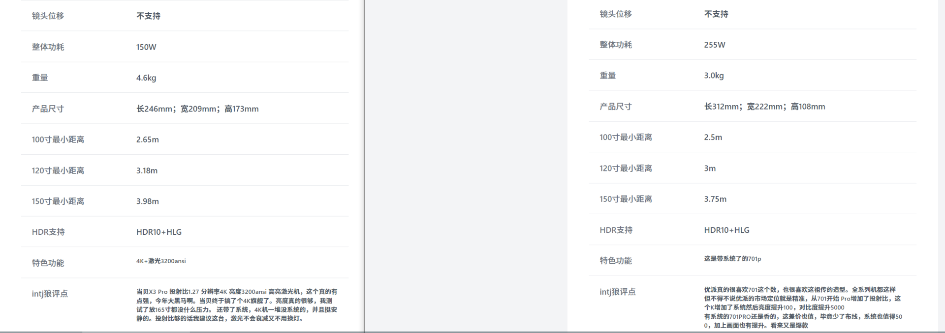 这是我对比工具自动生成的表格。先来说说对投射比,和焦距。优派的K701是1.13的最小投射比,而当贝X3PRO略微大点1.27。虽然我已经科普过很多次,但太多人还是没直观的理解投射比。因为跟电视的尺寸不一样,投影仪没有尺寸,只有投射比,尺寸是需要距离去算的。