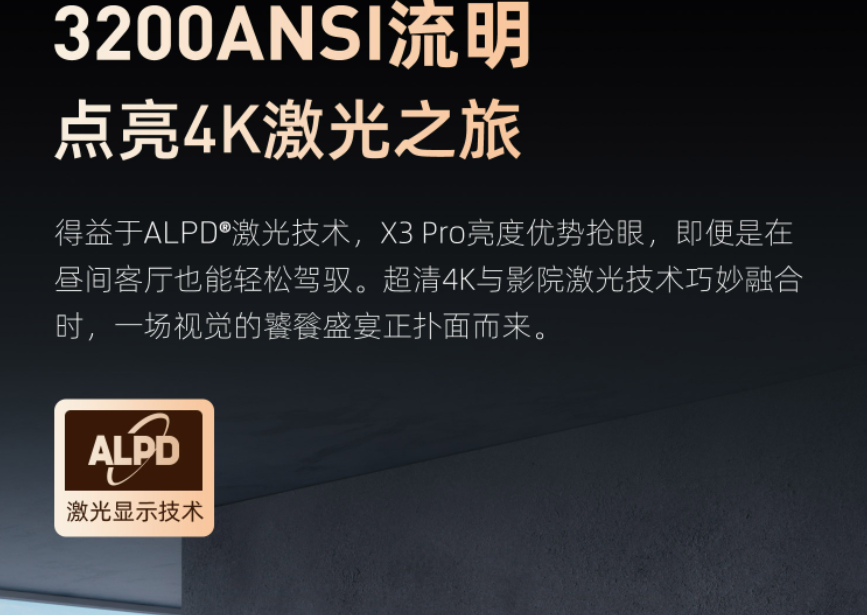 再到激光这个亮度高这个事情,单说激光确实是高亮,但最终体现在机器的亮度参数上,特别到投影这里,激光机还刚刚起步,并没有多少高亮的激光机,除了激光电视哈。所以X3PRO在上次测评获得我的大赞好评,是亮度3200lm的ANSI。环顾一下其他激光投影的亮度还在1000多的。这才X3pro才算是能配上激光高亮这个称号。