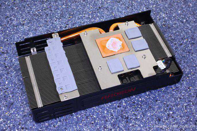 拆下散热片,可以看到它的板卡与散热器做工用料都很挺扎实,供电电路尤其显眼,也能通过一体式散热片进行散热。环绕斜置GPU的是4颗,共4GB三星GDDR6显存。