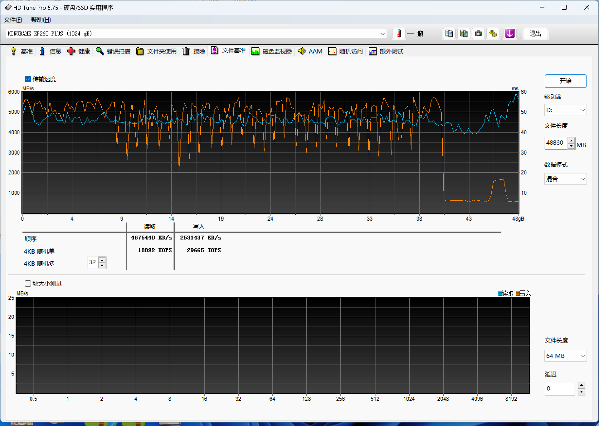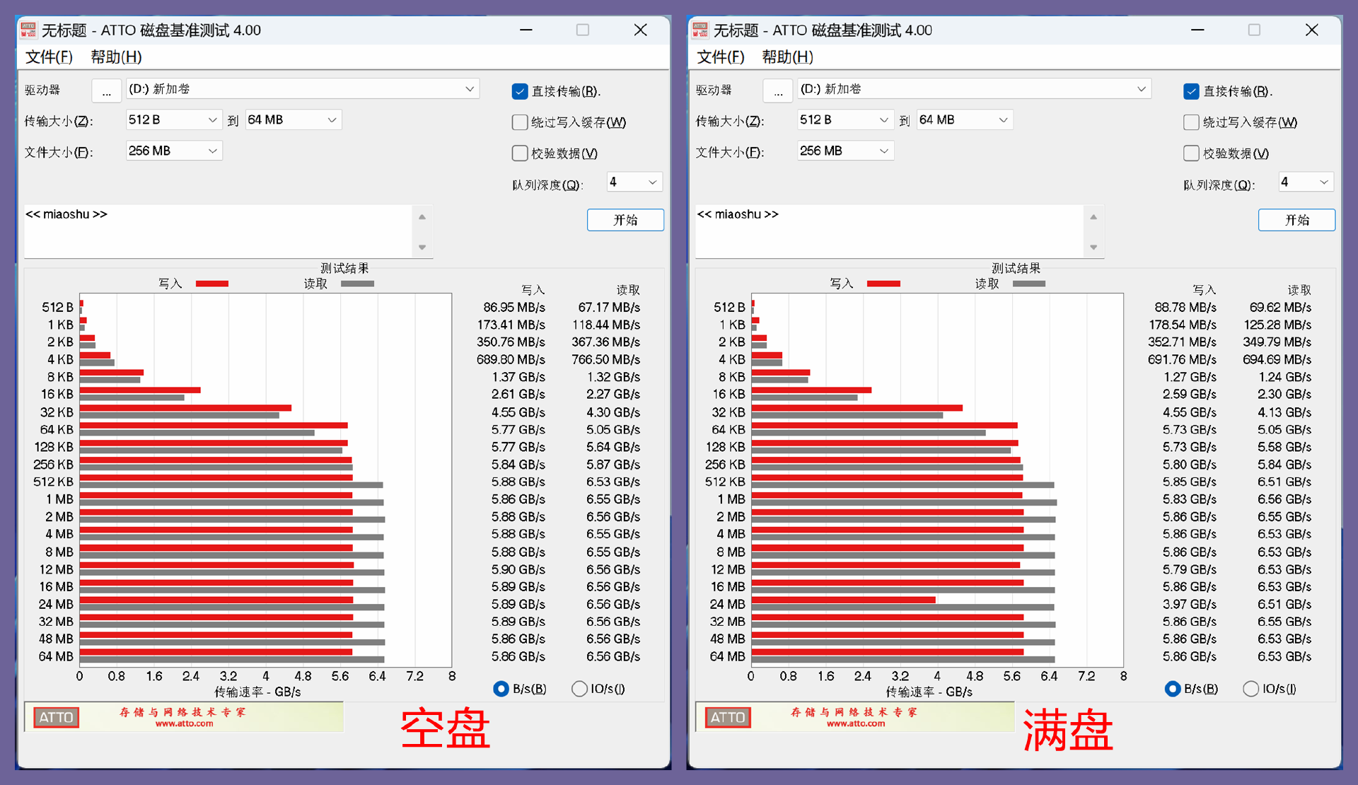 空盘与满盘状态下,ATTO磁盘基准测试的结果如下图所示,可以看到当文件大小在64KB以上时候,金百达KP260Plus已经能维持在顺序读写性能方面的稳态了。