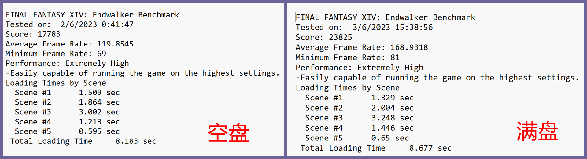 为了验证这个说法,这里使用最终幻想14的Benchmark测试程序,分别对金百达KP260Plus的空盘和95%占用下两种情景进行了载入时间测试。