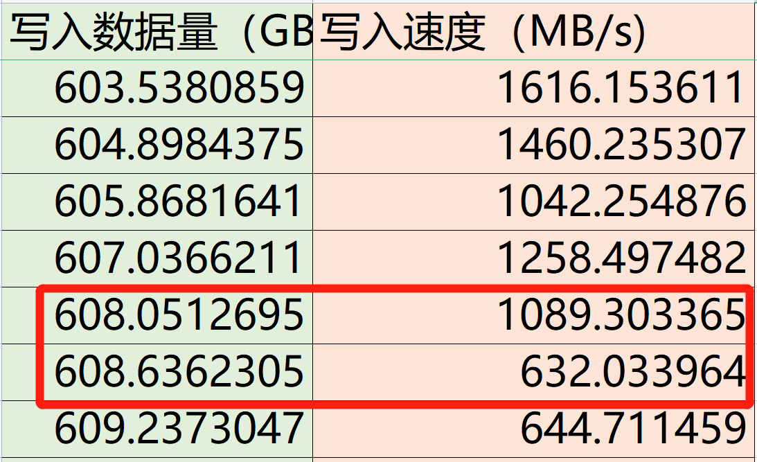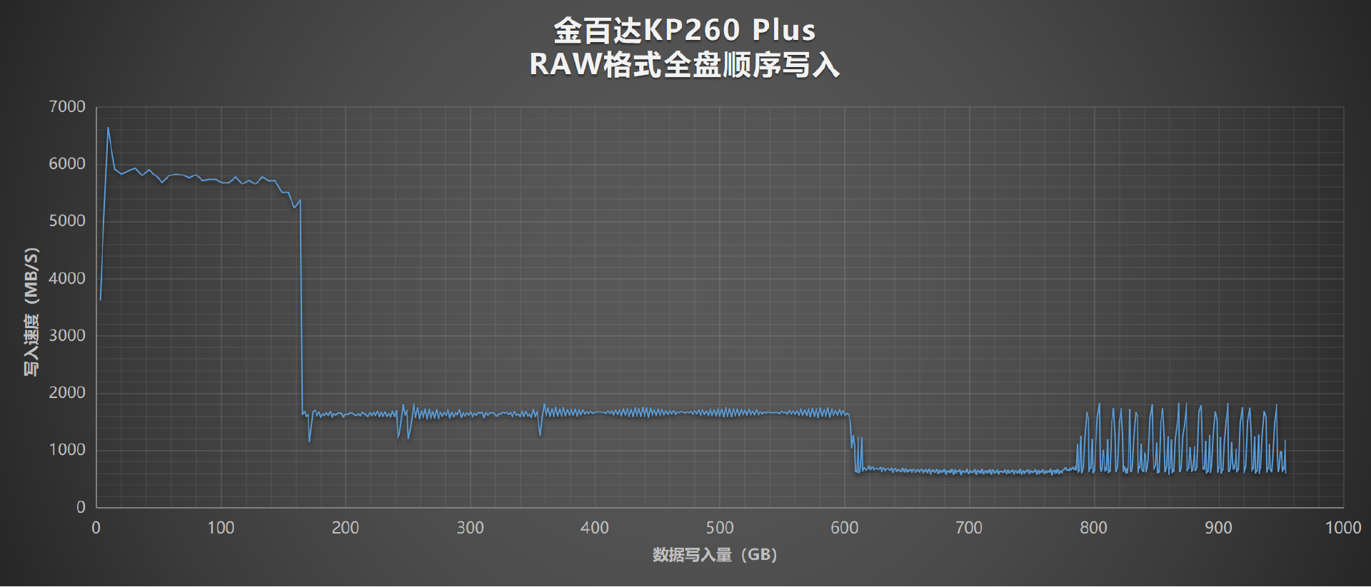在写入606G左右时,进入了最后一段最慢的垃圾回收阶段。此时主控又要忙着释放先前写入的SLC缓存空间,又要同时兼顾写入,速度降下来是正常情况。在这一段曲线中,金百达KP260Plus的写入速度依然能维持在600MB/s以上,也是相当出色的成绩了。