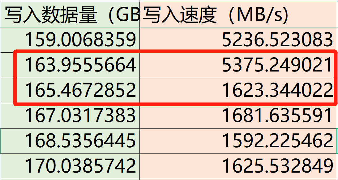 可以看得出来,空盘状态下的SLC缓存为160G左右,且在SLC缓存中的写入速度维持在5400MB/s-5800MB/s之间。大部分普通用户在平时很少遇到超过160G大文件的写入情景,以及基本可以理解为在绝大多数时间中,都能一直享受到这块硬盘的高速写入性能。