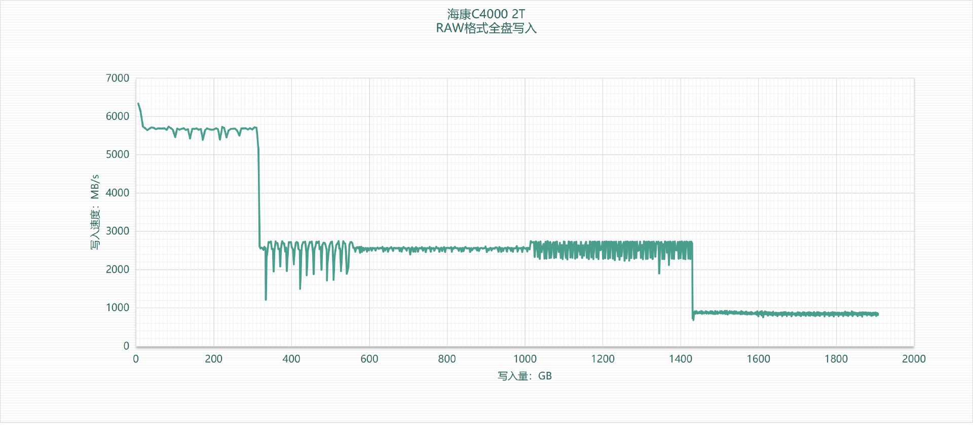 通过全盘读写测试,可以较为清晰的观察出一块固态硬盘的SLC缓存方案及缓外真实性能。这里我们使用TxBENCH为这块固态硬盘做了RAW格式的全盘顺序写入测试,并根据测试数据生成了一张直观的图表。