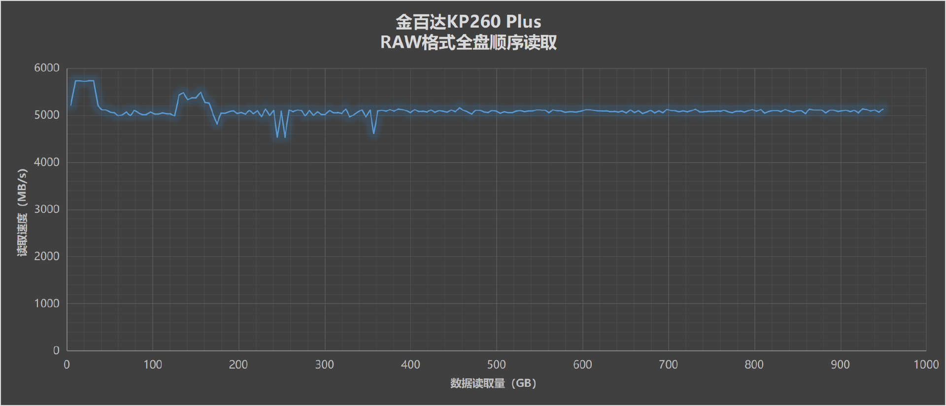 而全盘RAW格式顺序读取的速度图表如下,基本可以维持在5000MB/s以上的稳态直线: