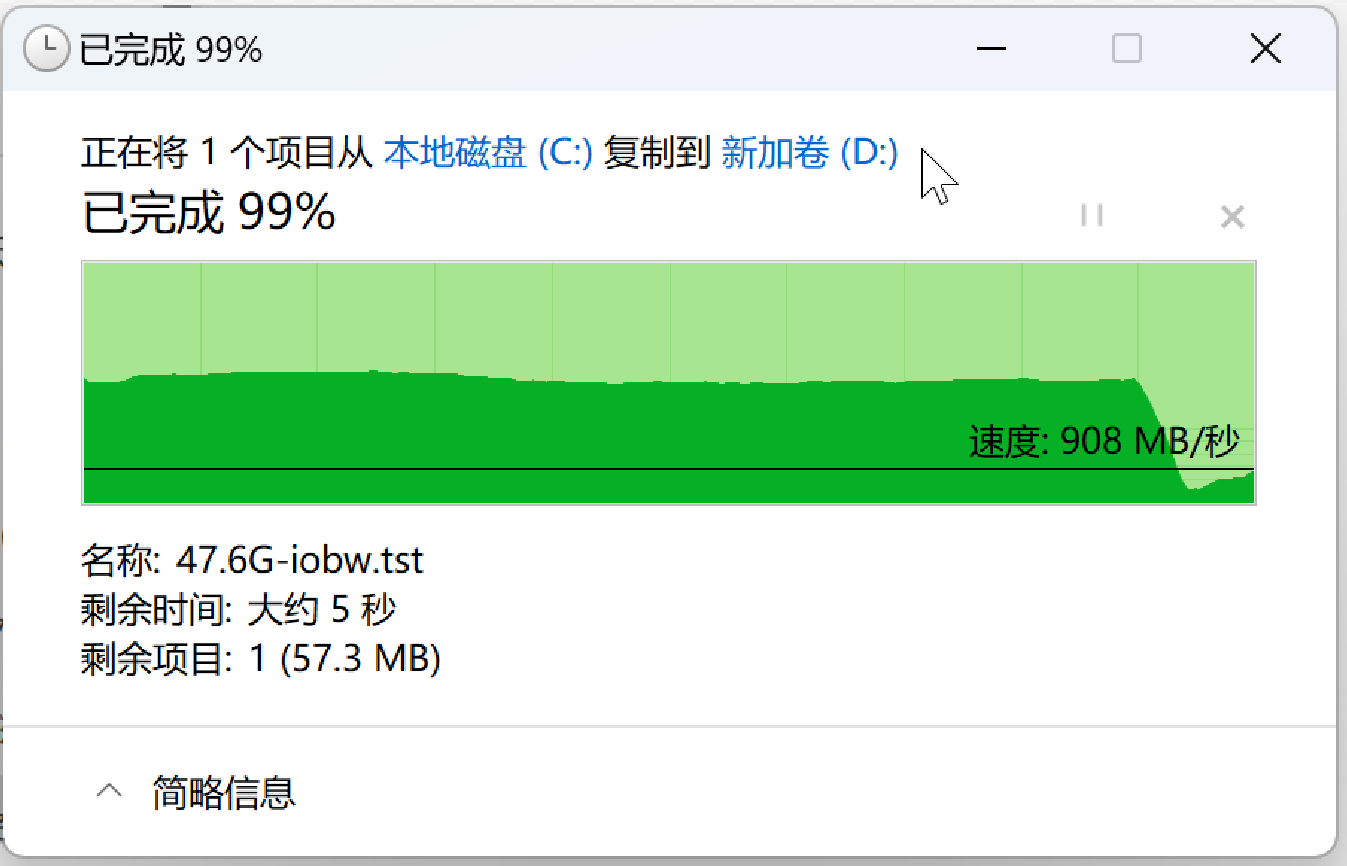 在95%占用的情况下,使用47.6G大小的单个大文件对其进行实际粘贴操作,性能表现也与HDTunePro的测试结果一致。所以看到这里,朋友们就不用担心这块盘在高占用下的性能表现了,即使接近满盘性能释放也依然非常积极。