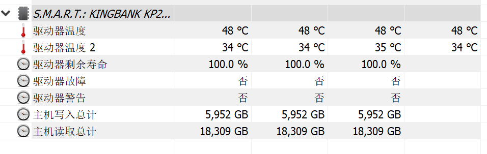 金百达KP260Plus默认拥有两个温度传感器,在室温29℃时,未安装散热片的情况下,待机温度表现大致如下图所示