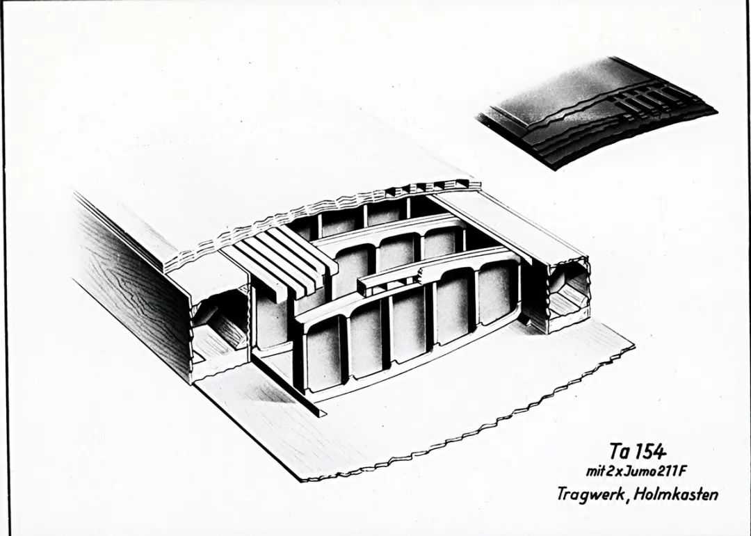图5注:Ta154的胶合板机翼结构,明显异于传统的铝合金结构
