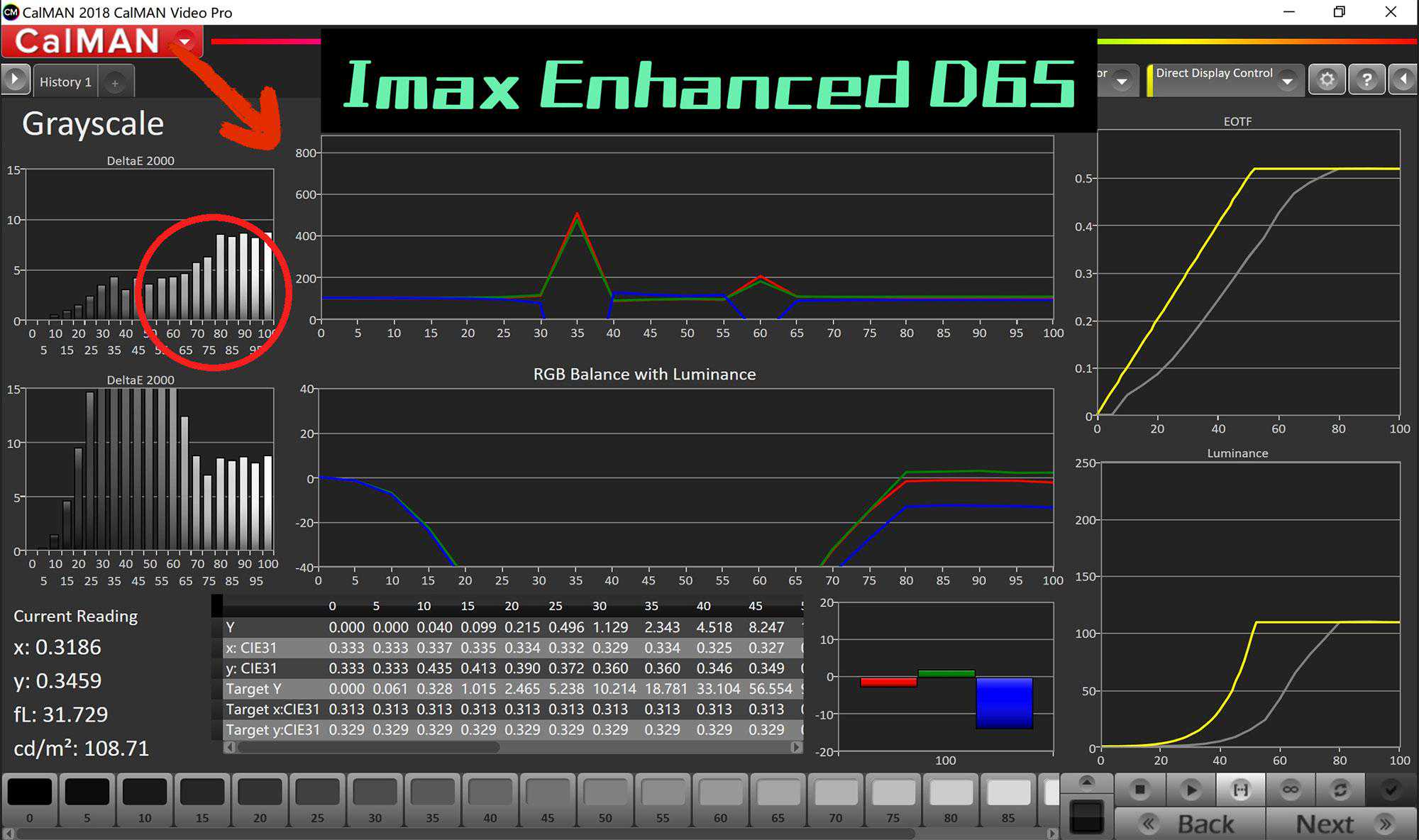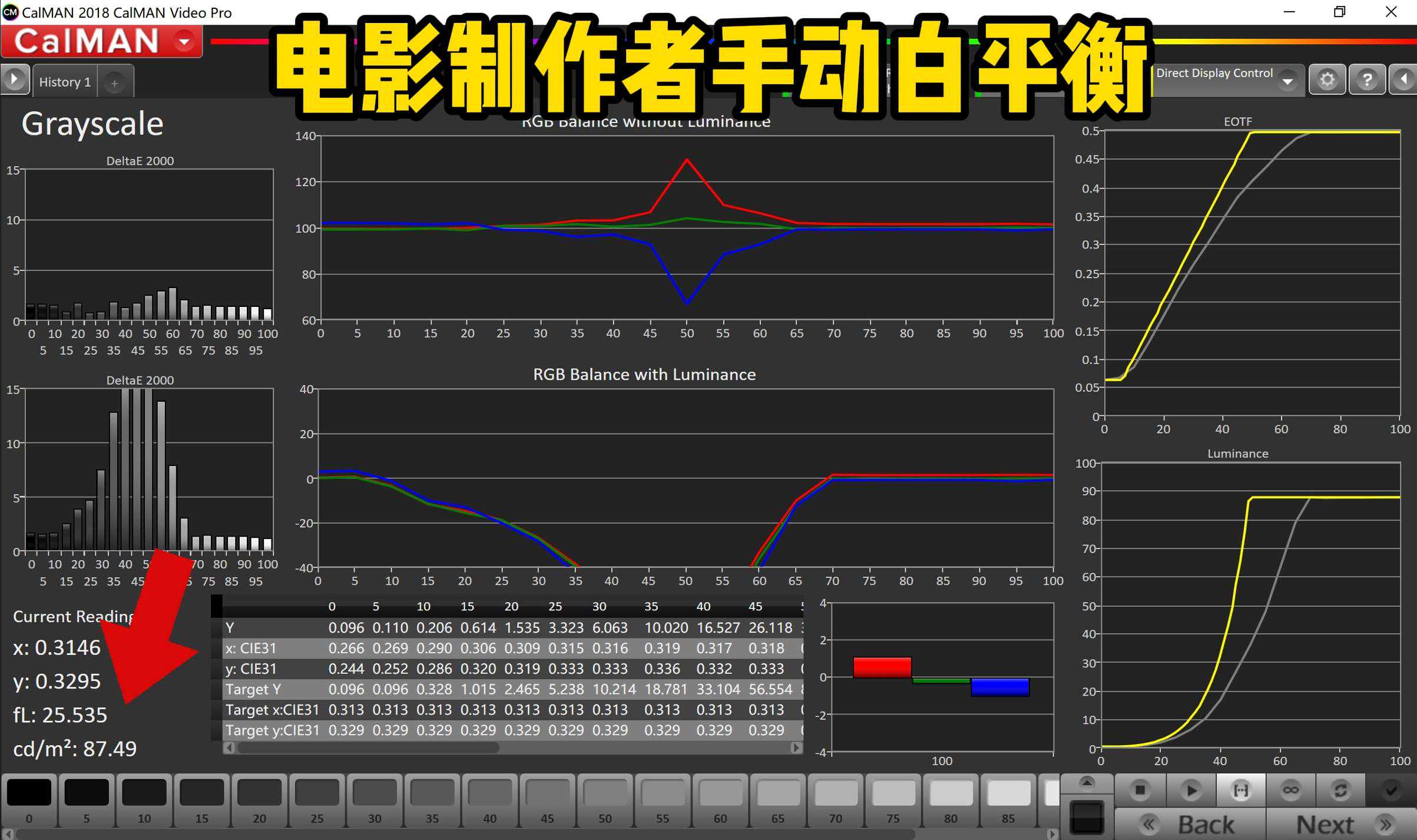 这时候,带亮度的白平衡波多最大的部分,看红色剪头所指最高也仅仅来到250多一点。这不比刚刚500低了一半。注意看,由于还原了D65设定,亮度也从31个FL回到了35FL。