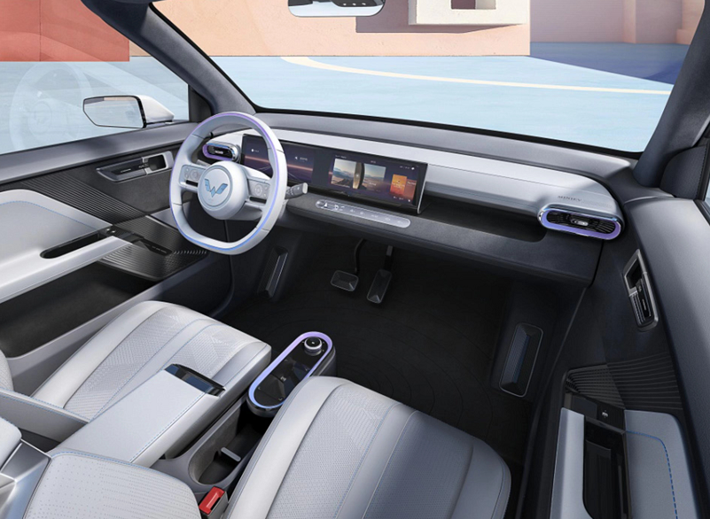 因为顶棚打开后对车身后部空间进行了侵占,新车采用单排双座布局。尺寸方面,长宽高为3059*1521*1614mm,轴距2010mm,略大于MINIEV马卡龙。内饰也更显运动感,一体式运动座椅+双辐双色方向盘,还有双联屏。