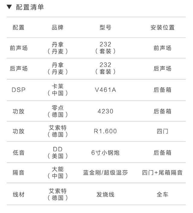 后声场同样选择丹拿232作为声场的衔接和补充可以使声音表现的更加淋漓尽致,立体感更强。同时弥补后排乘客的听音感受