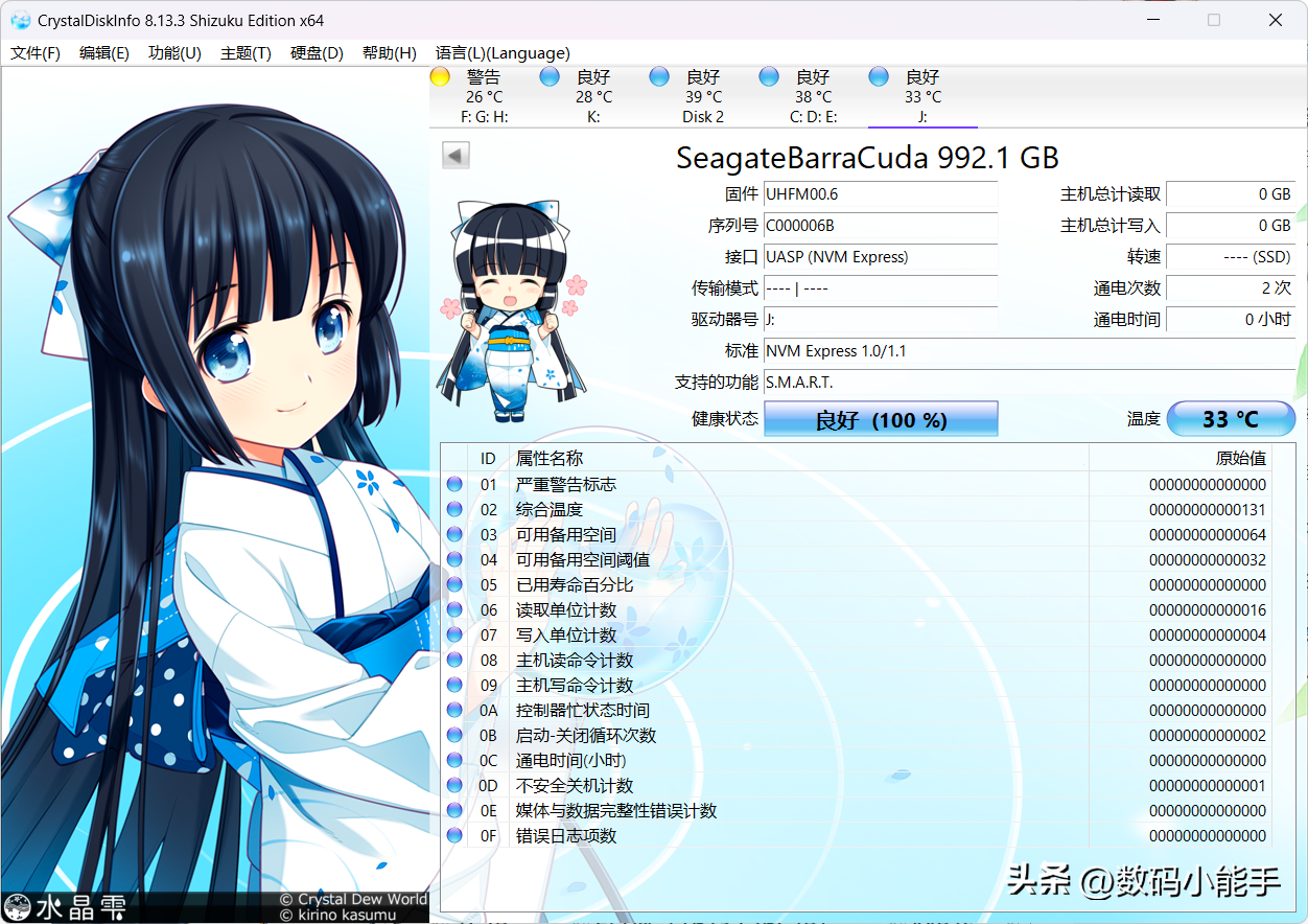 新硬盘到手一般会通过rystalDisklnfo看下它的整体参数与使用状况。通电次数为0,健康状态良好,基本没啥问题。