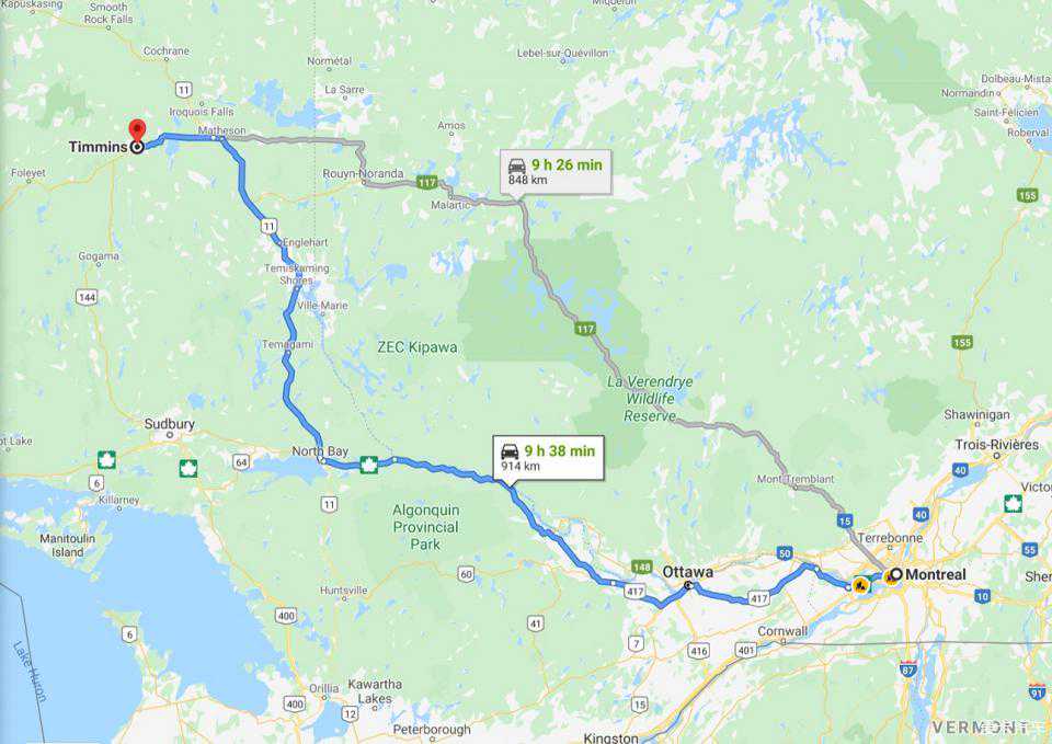 第一天:蒙特利尔Montreal,QC–蒂明斯Timmins,ON,行程约900公里