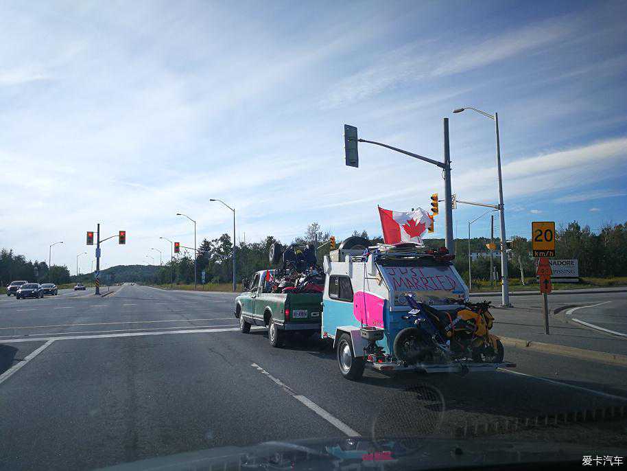 重新驶上11号高速,路遇一连串的大卡车上拉着加拿大陆军的各式装备车辆。