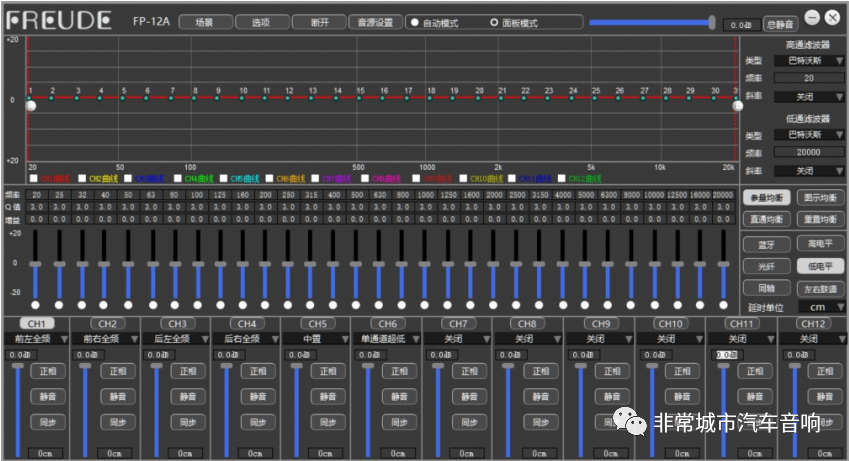 FP-12A作为一款专业数字音频处理器,可以通过电脑软件,进行全方位的调节,12个声道的每个声道都可进行31段EQ调试,以及主动分频、时间校正、增益、相位等项目调试,功能俱全,分辨率精确到1Hz,每通道输出配有多阶⾼低通独⽴滤波器。6-48dB/oct.的衰减斜率选择。调音界面简单明了,每个声道都可做到更精细调控,让声音更加的精准。输入信号类型支持8通道高电平、2通道低电平、数字蓝牙、光纤、同轴。接线端口简单易懂,可自动音源切换及支持外接控制面板切换。