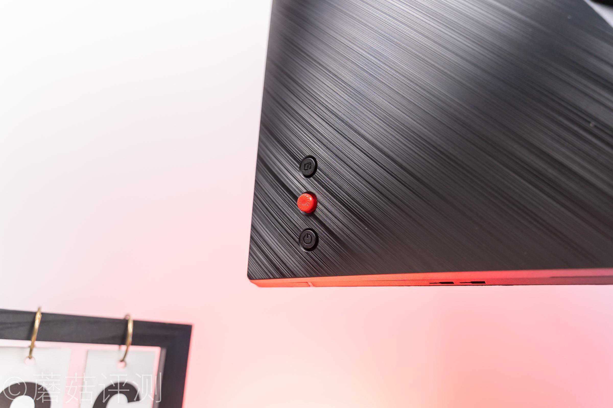 ▼显示器的左下角是操作面板,最下面是电源按钮,中间红色的是摇杆,用于显示器菜单设置。