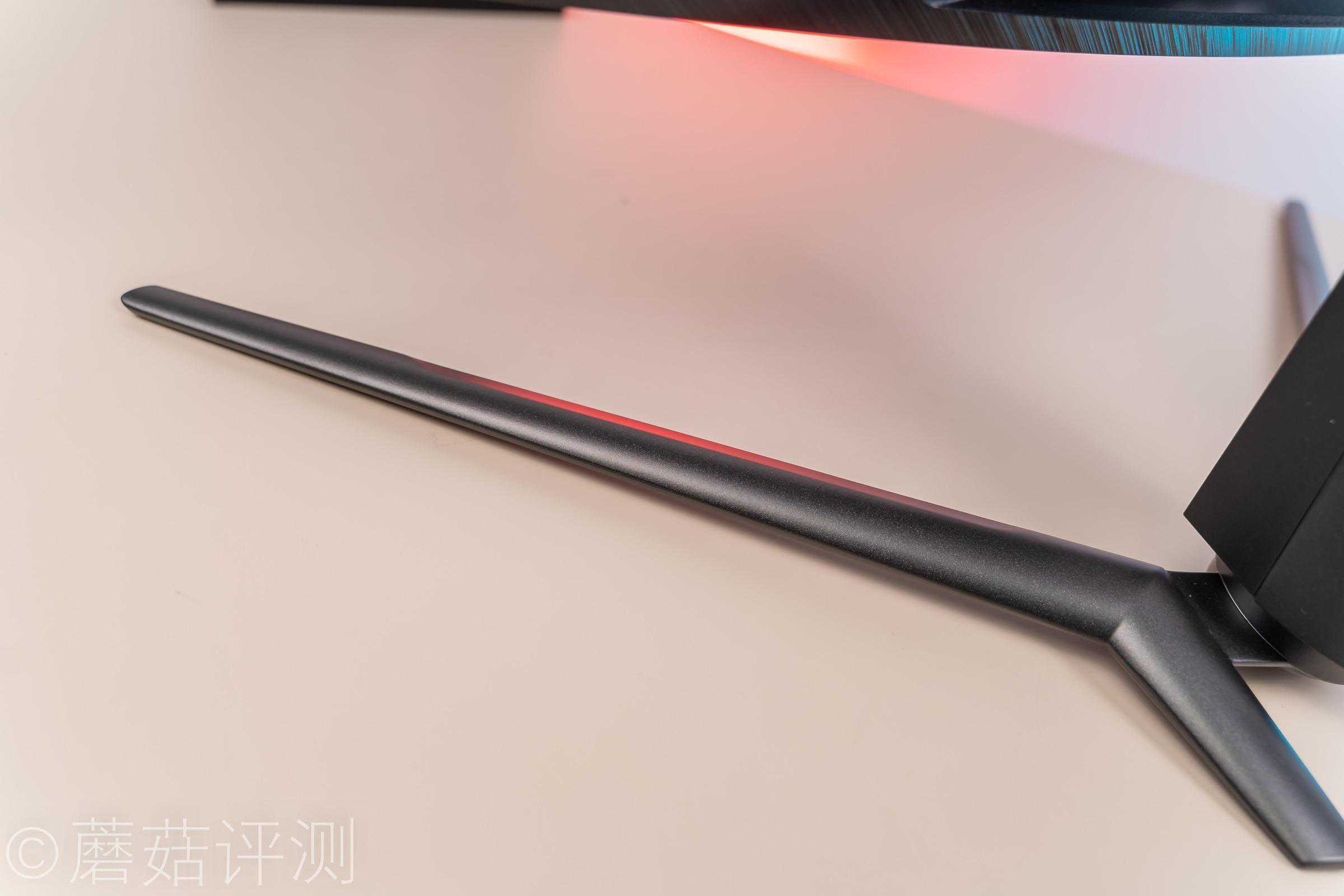 ▼显示器的支架很漂亮,支柱的外侧是镜面的,有光影效果,很漂亮。