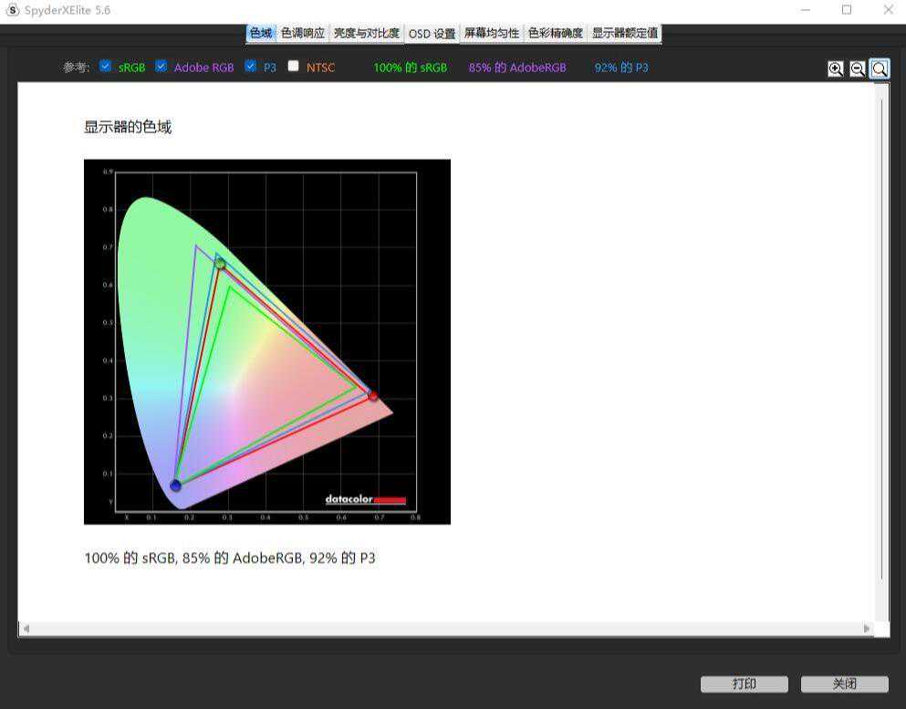 ▼简单测试下显示器的色域,可以轻松覆盖100%sRGB、85%AdobeRGB、92%的P3色域,这块面板的色域表现还是非常不错的。