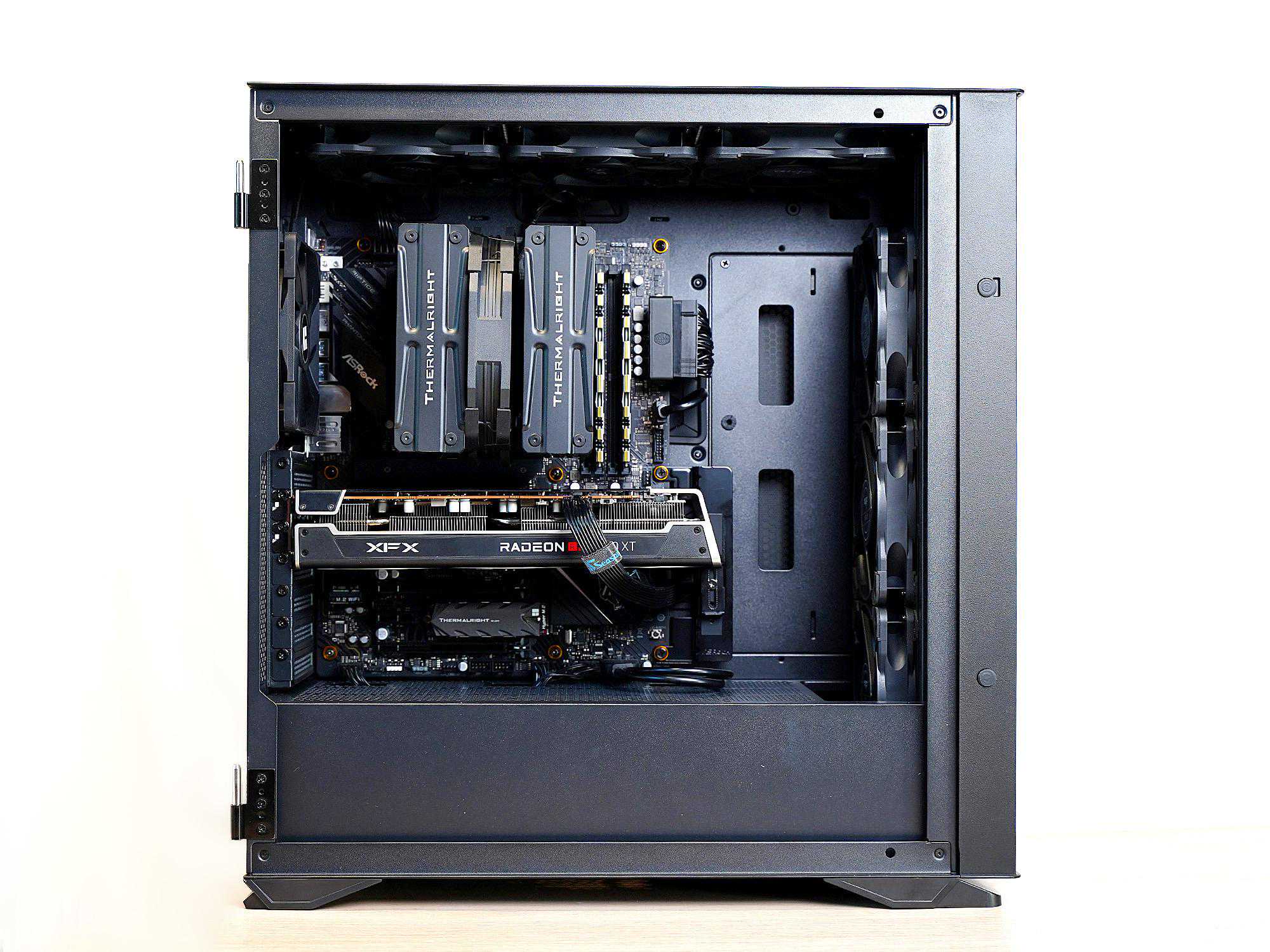 主板托架前面有一个3.5寸的硬盘架,拆下后可以侧放冷排。另外这种设计也让机箱可以放入一定尺寸的E-ATX主板,或者在前部进行分体水冷的安装。兼容性方面显卡限长400mm,风冷散限高180mm,预留空间是足够的。