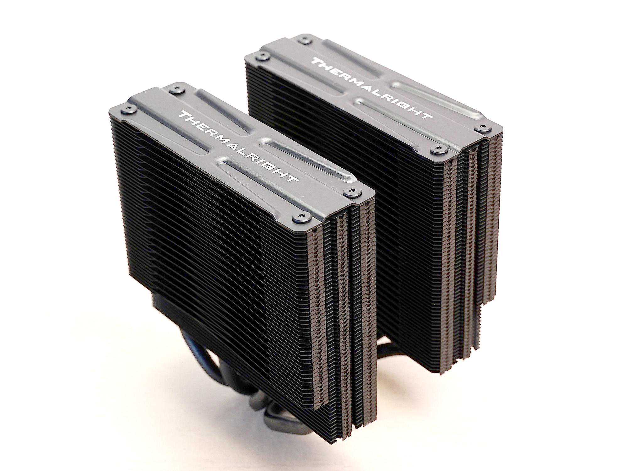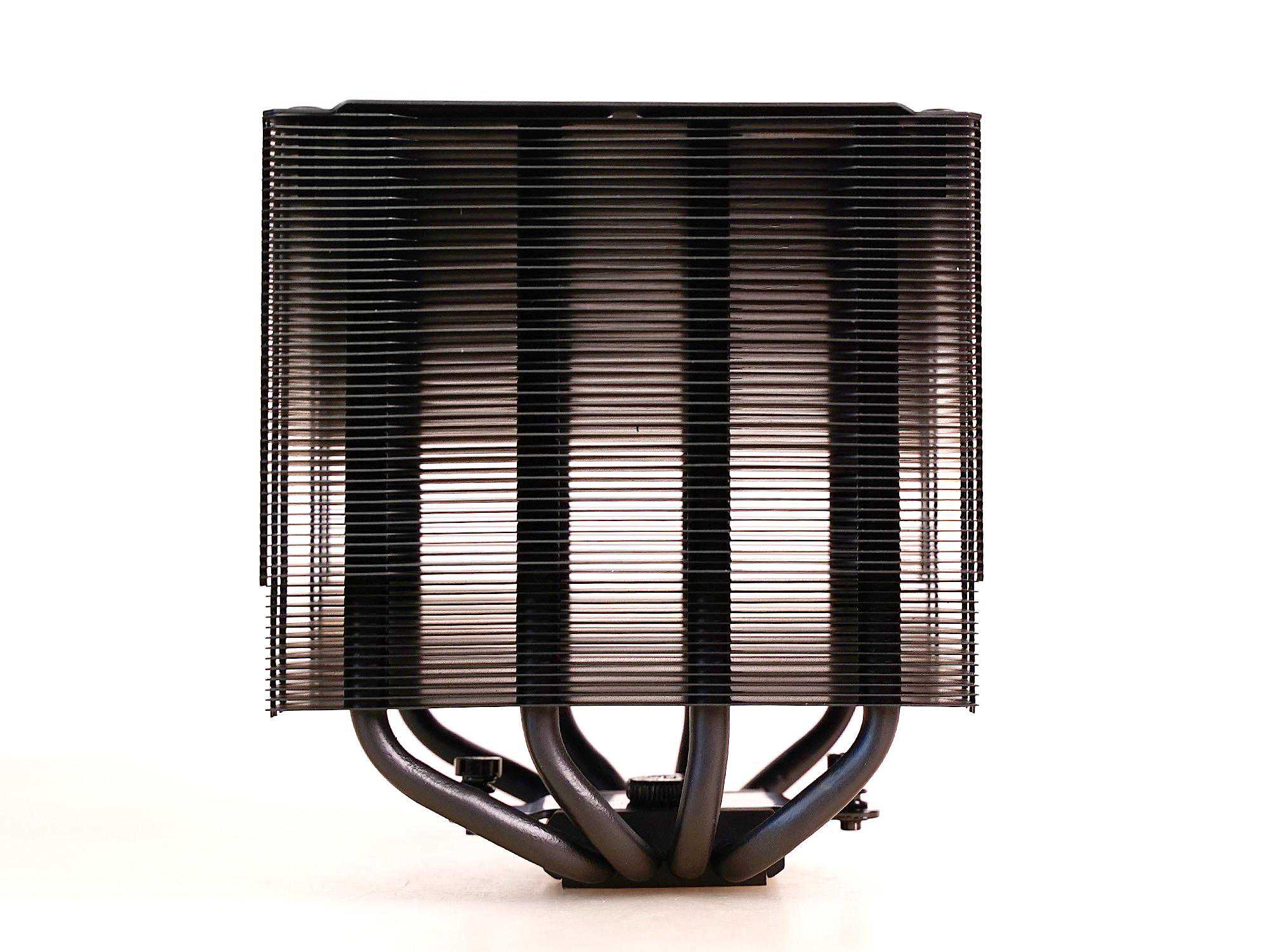 散热器本体(不含风扇)的尺寸是140*121*158mm,重量为1kg。双塔设计,每座塔上有58片鳍片,鳍片与热管采用回流焊连接。BLACK版的鳍片、底座以及热管都进行了阳极氧化全部涂黑。