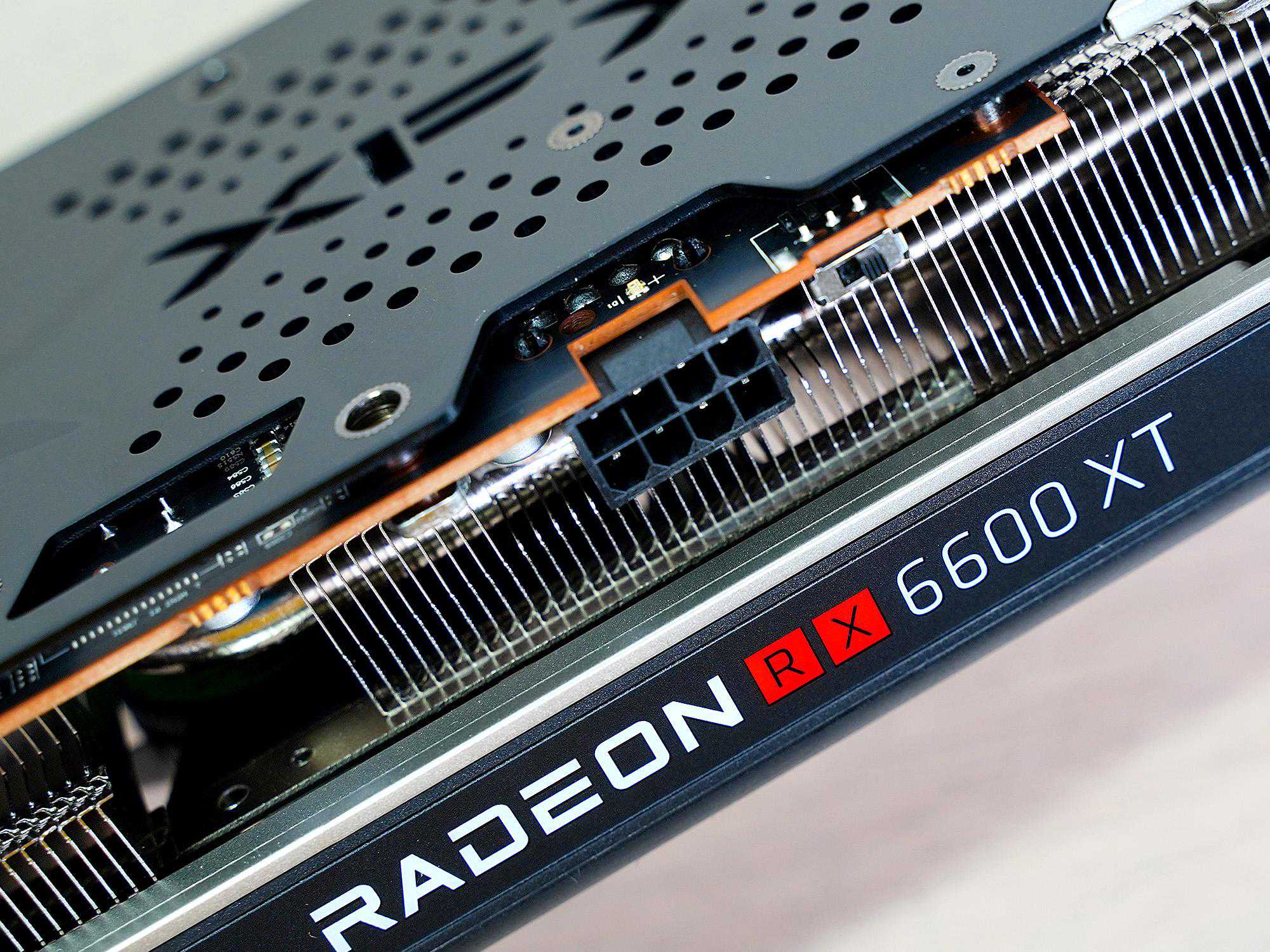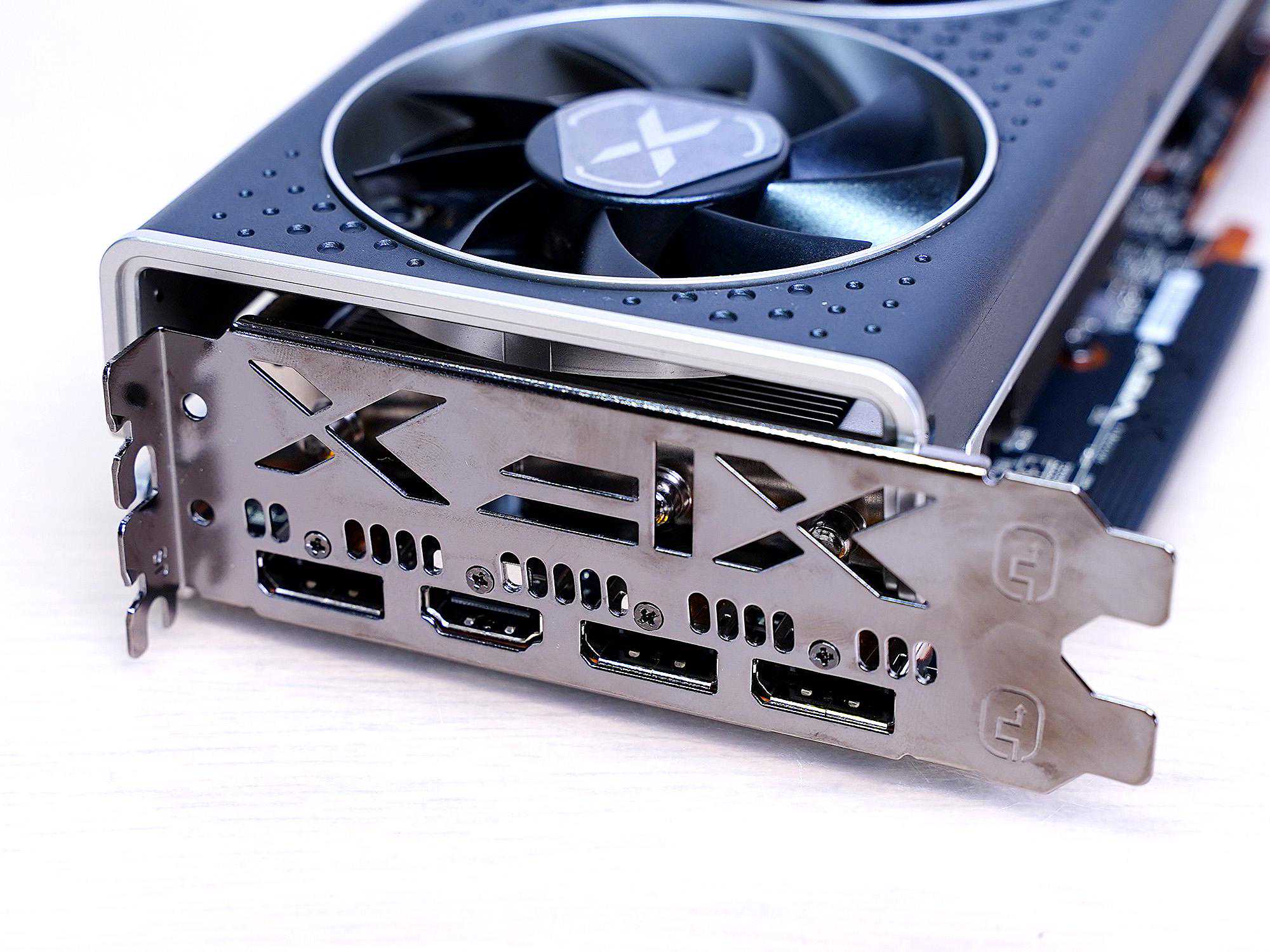 厚度基本就是标准双槽显卡,不过外壳要稍稍超出一点。侧面有RadeonRX6600XT和XFX的LOGO,有LED,RX为红色,其它为白色,不可调节。