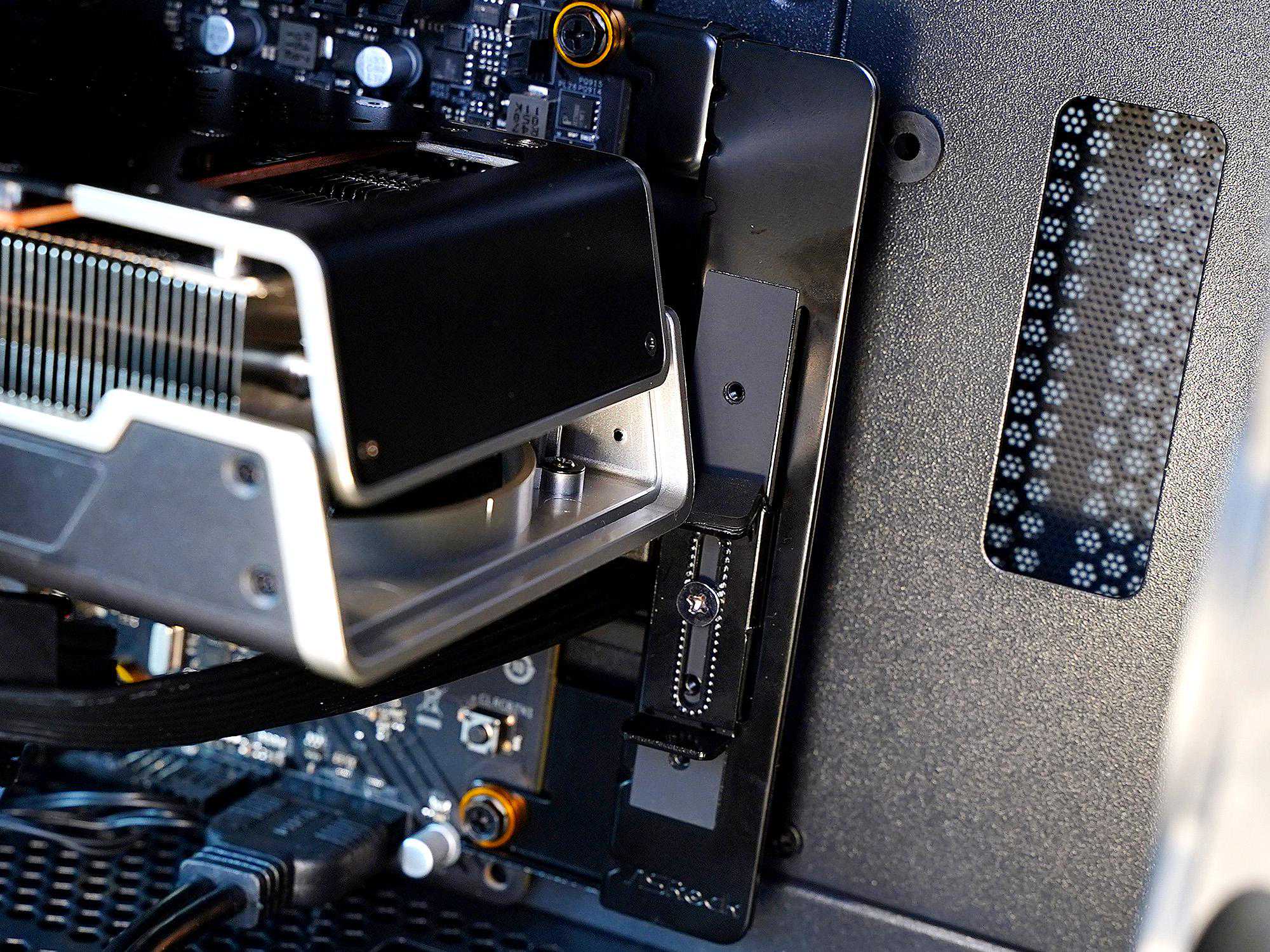 该支架安装在主板右侧的两个主板孔位上。但显卡的长度一定要超过主板的宽度3cm左右才能让这个支架起作用,如这块274mm的6600xt也就刚刚能搭上一部分支架。