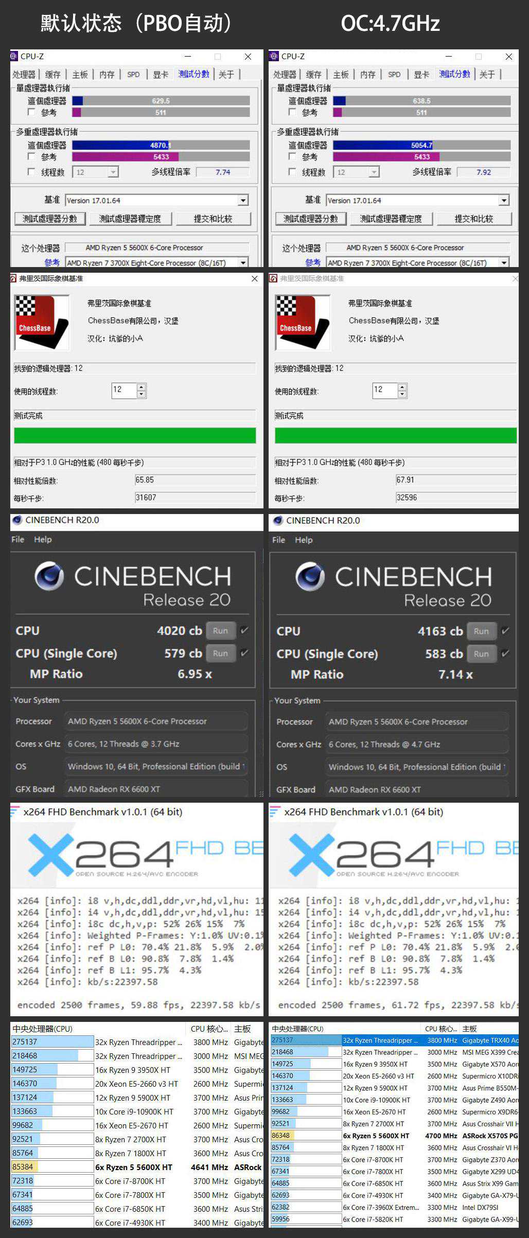 CUP是6核12线程的锐龙55600X。AMD调节手段有PBO和手动超频。PBO操作相对简单,成功率高,有更高的单核频率。但也有缺点:电压较高,多核在高负载下频率较低,而且高频的单核是核心交替接力,可能会在一些应用上造成不稳定。所以还是选择了手动超频,BIOS电压设置为1.3v,可以达成全核4.7GHz,相对PBO的方式,电压可以低了一些,做了和默认状态下的跑分对比。另外PBO默认为自动档,单核频率并没有太高,如果使用手动模式可以调到单核最高可到4.85GHz,当然这时就像前面说的电压太高了!