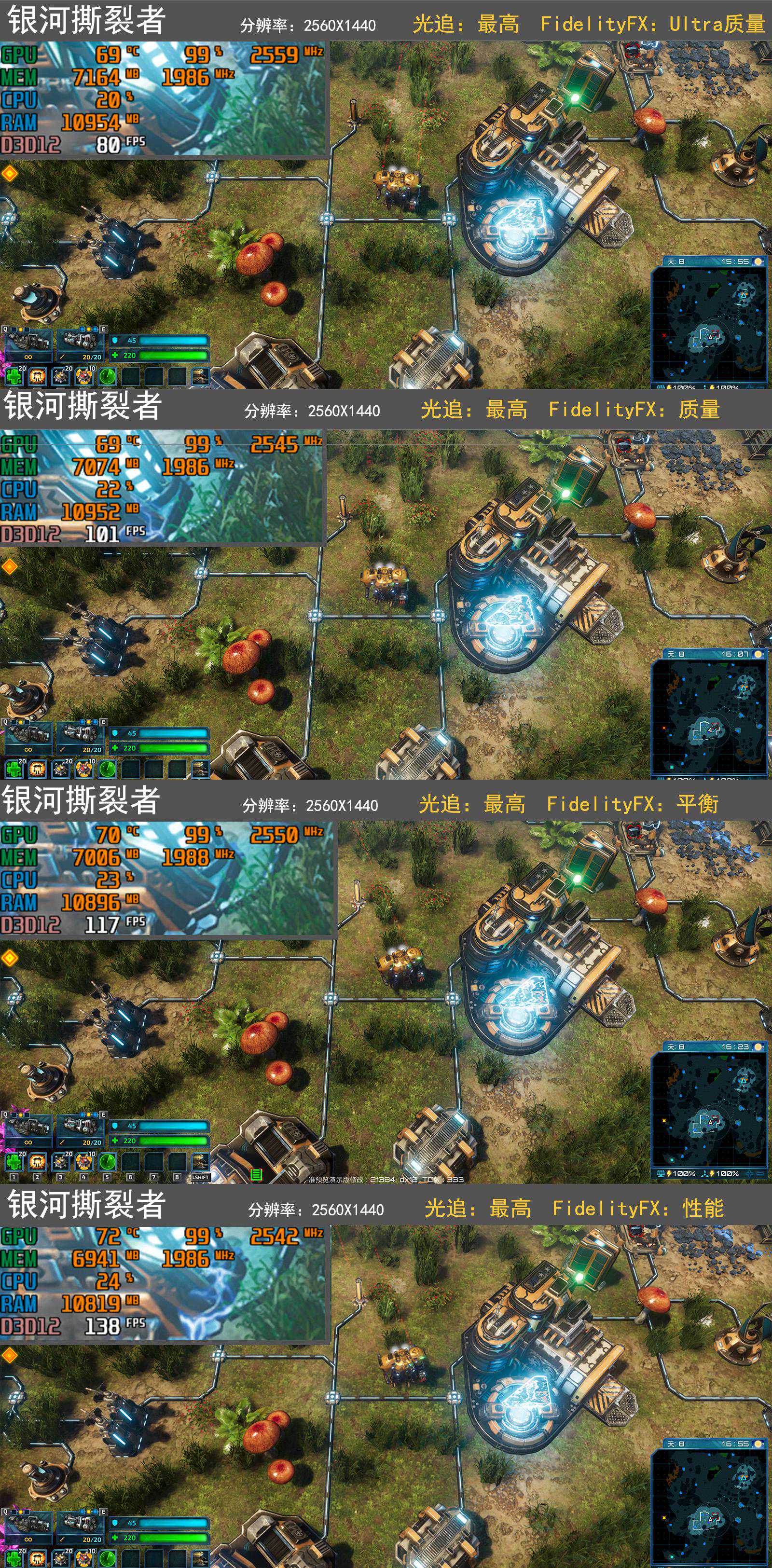 现在已经有7款游戏支持FSR了,《银河撕裂者》就是其中之一,另外它还支持光追特效,开启光追后帧数降幅达到了~50%,基本被腰斩了!(没有bench,只能手动截取实时画面了)