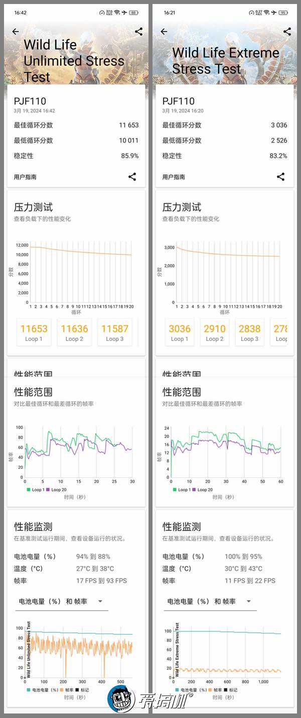 一加Ace3V在3DMark烤机中,最高温度50.8度。3DMarkWildLifeExtremeUlimited测试稳定度83.2%,WildLifeUlimited测试稳定度85.9%%。