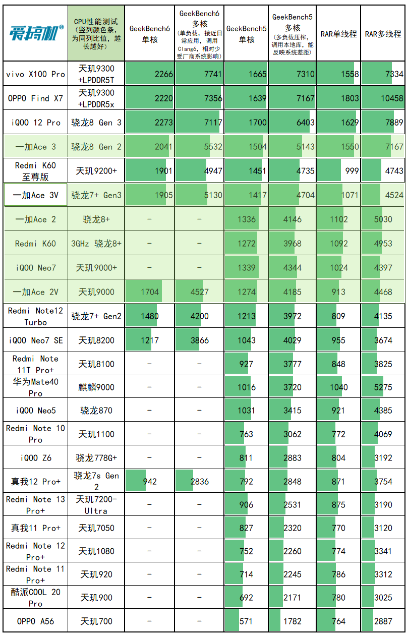 CPU性能测试(每一列,颜色条越长,越强)