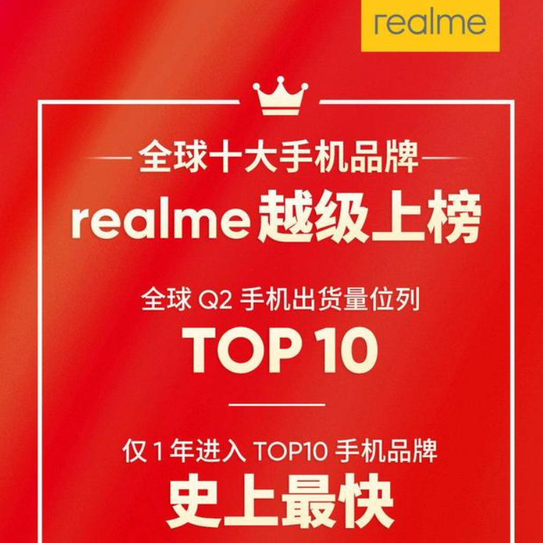 值得一提的是,realme自发布新品进入市场之后从未停止步伐,一步一步跻身全球主流品牌,提高自身的排名。2019年第二季度,realme以470万台的出货量跻身全球出货量前十,耗时近1年。可以说是史上最快进入十大品牌的手机厂商。