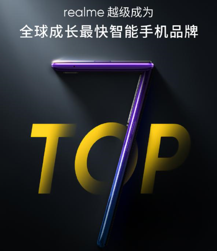 2019年第三季度,realme出货量超1000万台,仅用三个月从全球前十上升至全球第七,同比增长808%,成为全球成长最快的智能手机品牌!
