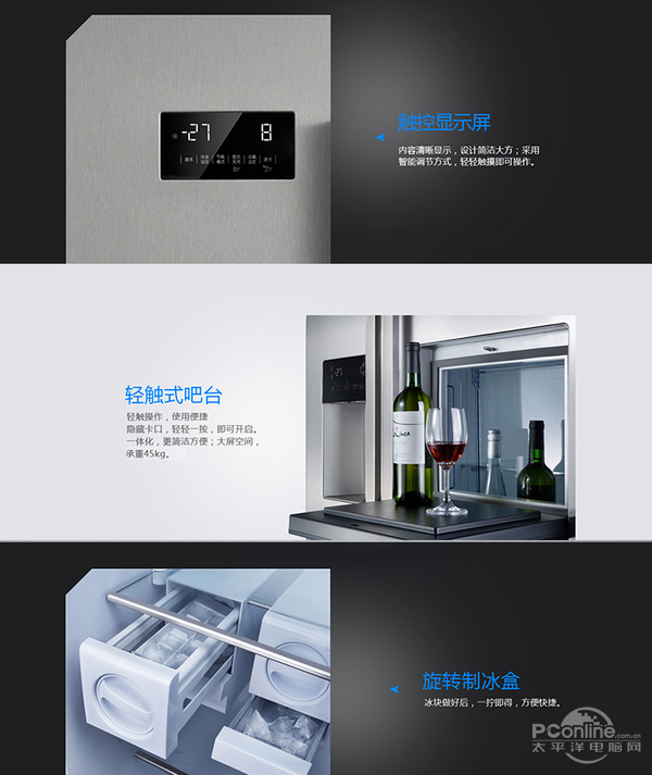 魔方导风,避免冷风直接对吹食物,防止食物干燥;温度均匀,温差小。此外,冰箱还内置了触控显示屏、旋转制冰盒、LED冷光照明等功能与工具。