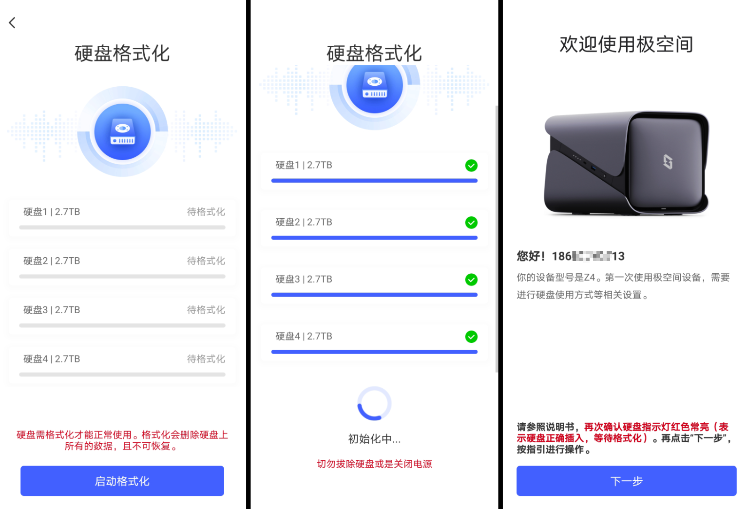 特别提醒,无论您用哪个模式,装入的硬盘都会被格式化,请确保硬盘里的数据是否安全: