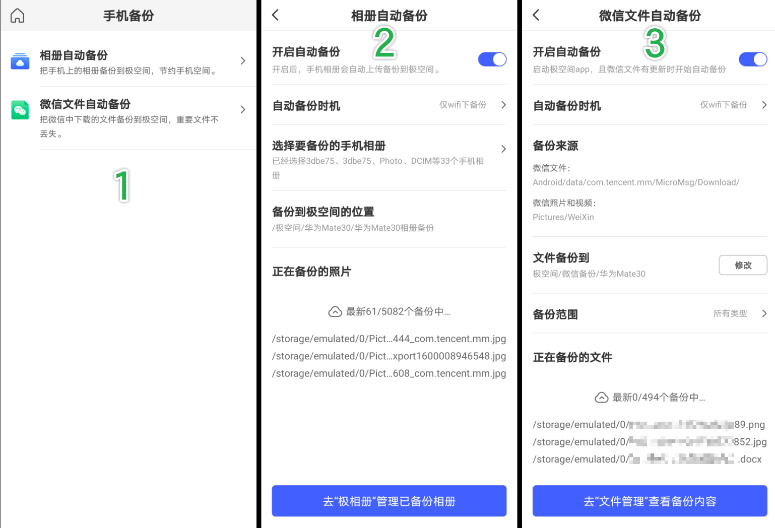 比如我们常用的手机备份功能,可以一键备份手机里的照片和微信文件: