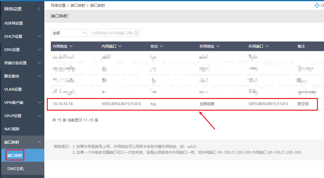 5、比如,我在爱快软路由的端口映射中,将这几个端口映射一下: