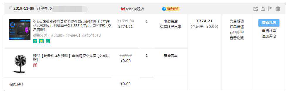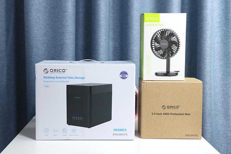 盘位越多,柜儿越贵,这ORICO5盘位大仓库叠券七百七左右拿下,送了一台可调俯仰角、3档风速可调的桌面USB小台扇,右下角那个纸箱里面则是5个ORICO硬盘独立收纳保护盒,应该也算是赠品,减去售价,应该很合算了。