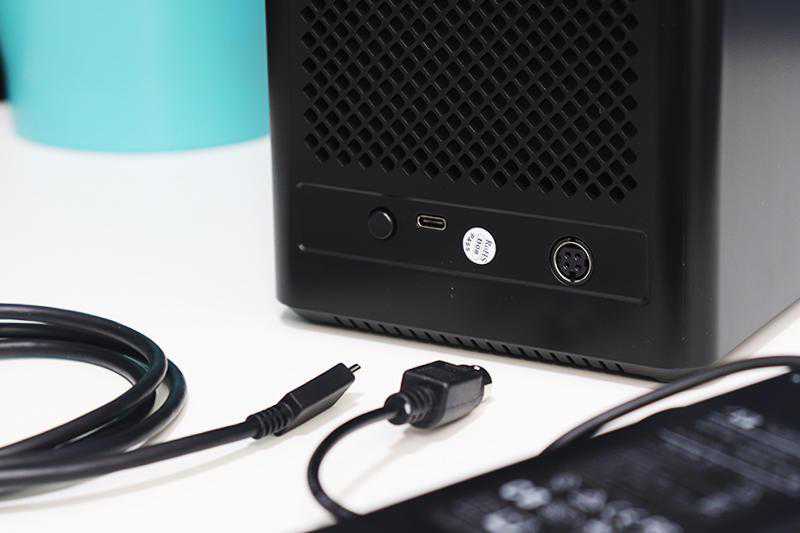 注意到电源接口不是通用的圆口,而是这种4孔防反插圆插。它与Type-C数据线接口均安置在硬盘柜后部,Type-C接口旁还有POWER电源键,在往上就是大面积散热网孔。