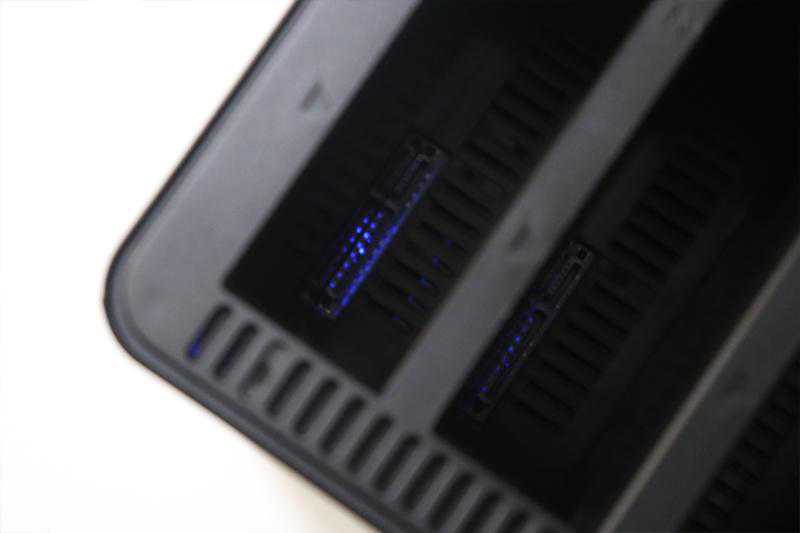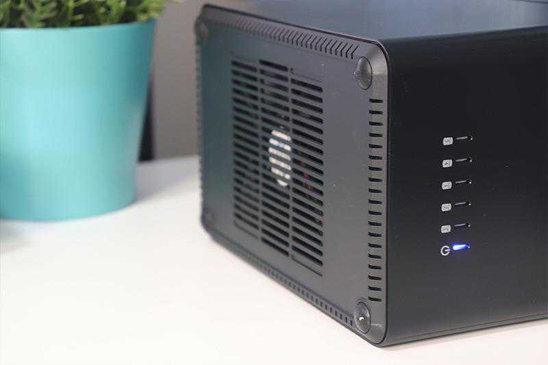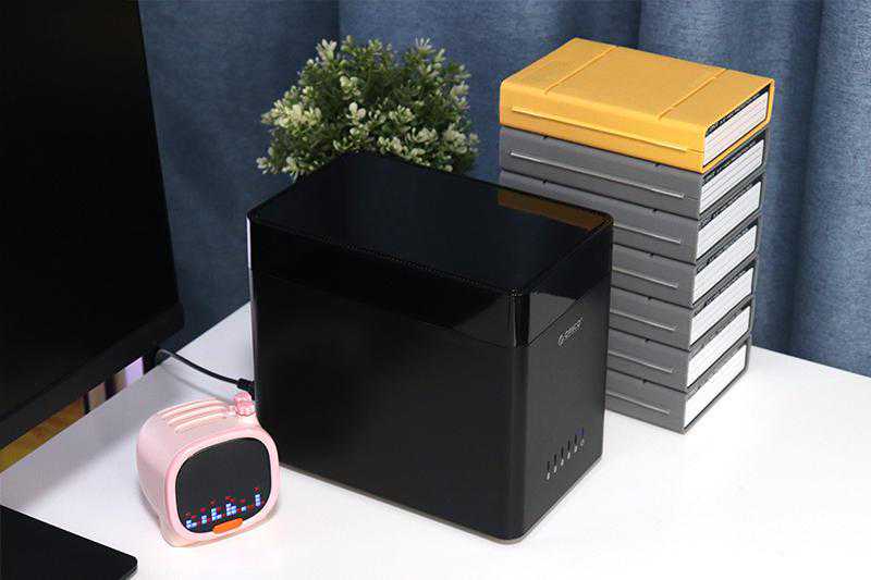 由于左右两侧几乎没有任何开孔,作为桌面硬盘柜安置在桌面低调养眼。顶盖钢琴漆面反光透出一丝优雅,不过四周暗藏一圈散热孔道,不仔细看是会忽略的。