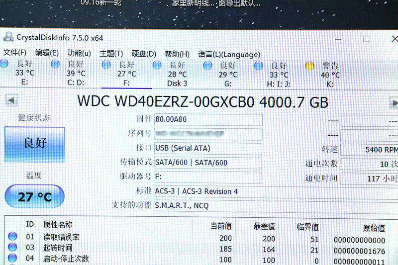 通过CrystalDiskInfo查看各硬盘概况良好,闲置状态硬盘温度保持在35°以下(盘符F、Disk3、G、HIJ)非常凉快,只有使用超过10年的80GB希捷老硬盘温度达到40℃(K盘)。下图为F盘西数4TB5400转蓝盘的基本信息,温度27℃,以基本没用过几次,通电次数才10次。