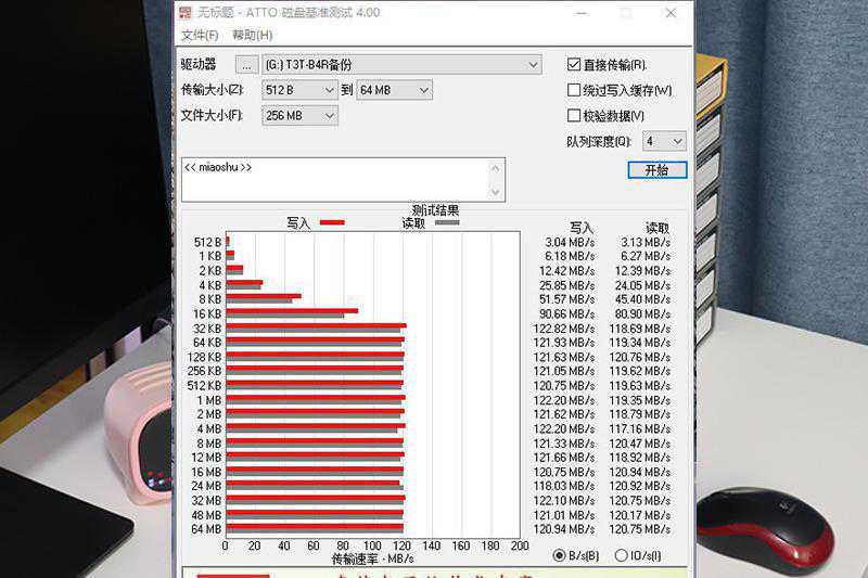 直接用ATTO磁盘基准测试对这块4TB蓝盘做个测试留作备忘,读取速度接近120MB/s,写入速度121MB/s以上。