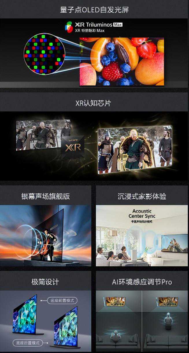 索尼目前主打走量的OLED型号,相比A95L系列价格更加亲民。产品整体的性能表现还是很出色的,索尼看家的XR认知芯片+XROLED对比度增强PRO+XR特丽魅彩PRO+XROLED动态流畅+银幕声场旗舰版都有配备。峰值亮度达到了1000nit,配合索尼的XR芯片和专有技术的调教,整体画质表现出色。支持两组全功能端口,支持VRR和ALLM,支持120Hz高刷,对主机游戏玩家十分友好。屏幕支持97%DCI-P3色域,拥有出色的HDR效果。尺寸方面支持OLED电视常见的55/65/77三个规格可选,其中无摄像头的版本还有更大的83寸可选。适合喜欢OLED电视或者高画质,同时预算也比较充裕的顾客。